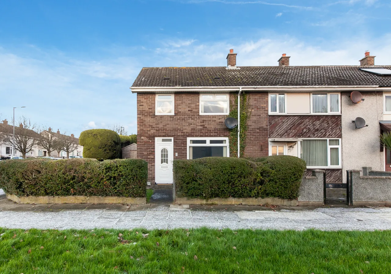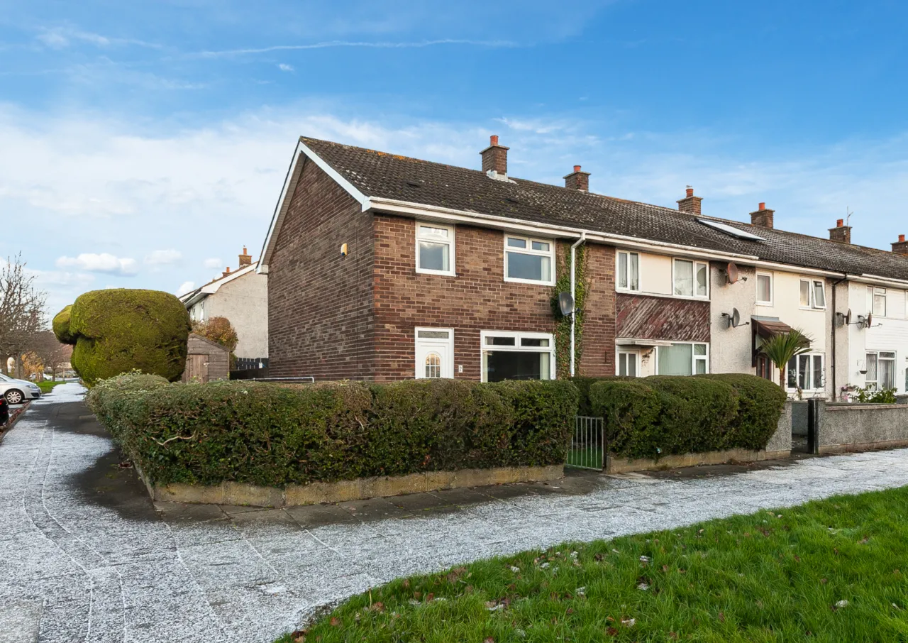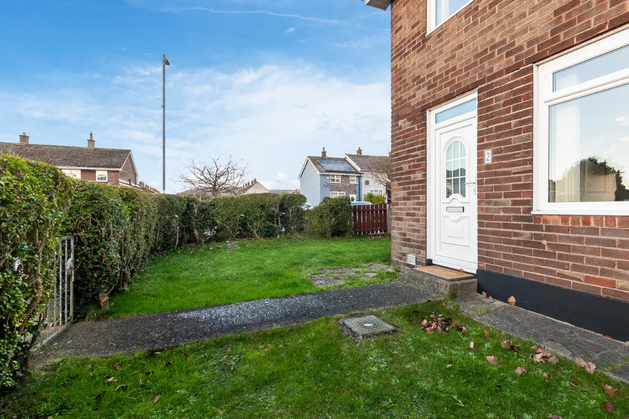 Enclosed front garden with bordering hedging.