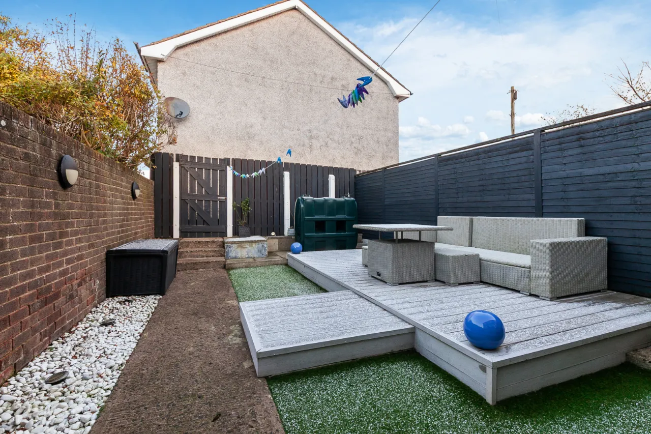 Fully enclosed rear garden with paved patio area, raised composite decking area with bordering fencing and wall. Outside lights and tap.