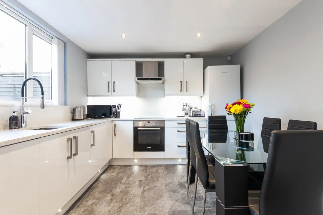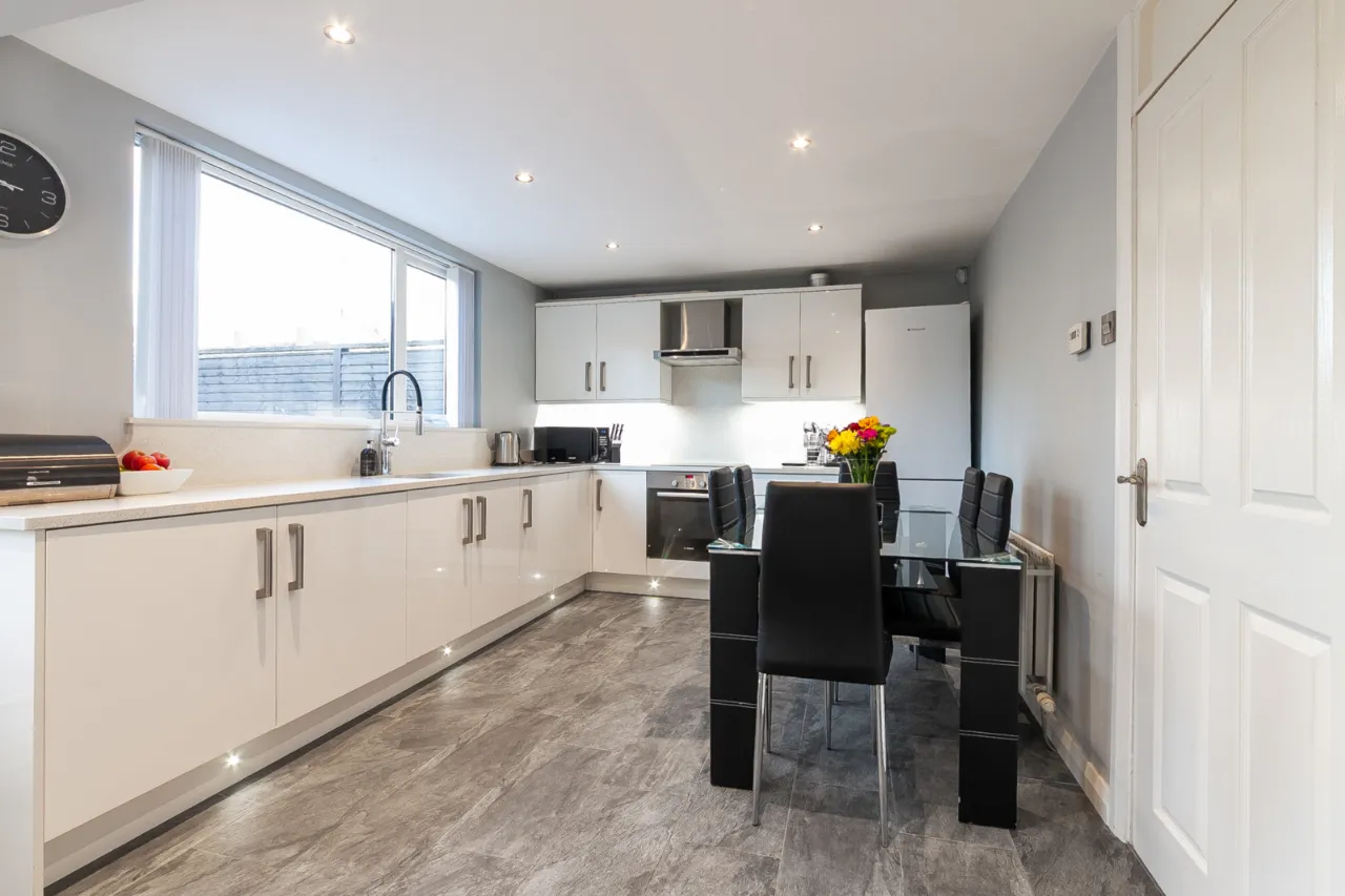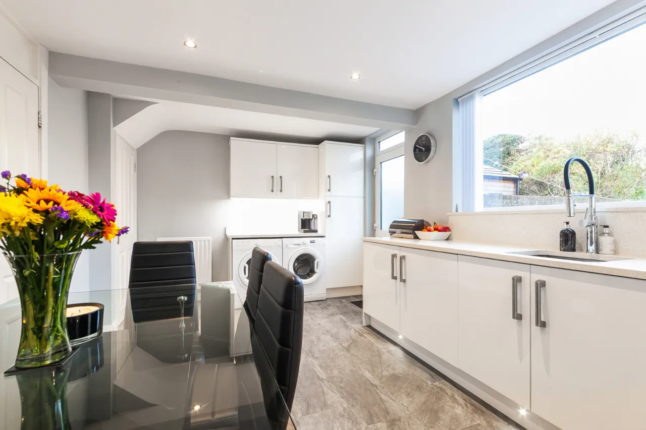 Excellent range of high and low level units, stainless steel FRANKE sink and tap. Quartz worktops, four ring Hotpoint induction hob and under bench oven, overhead extractor hood, space for fridge and freezer. Plumbed for washing machine, space for tumble dryer, larder storage, ample driving space, recessed lights, under stair storage and access to rear garden.