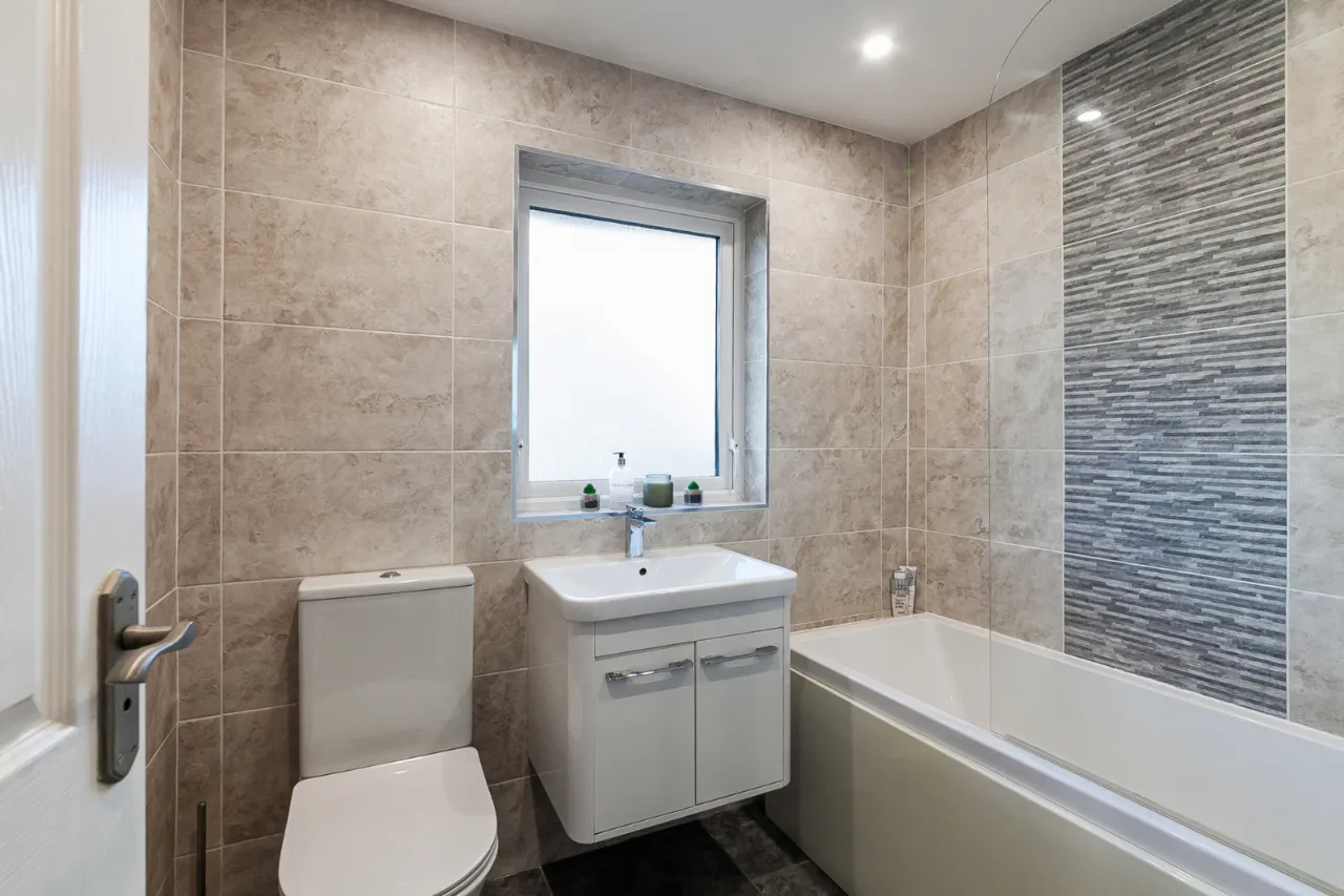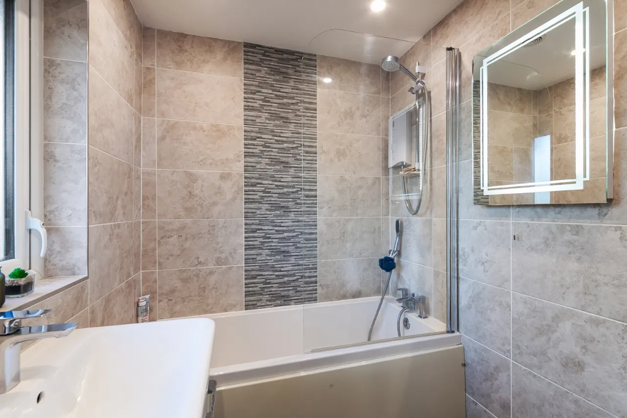 Comprises of paneled bath with mixer tap, overhead shower with shower screen, tiled walls, ceramic bowl sink with mixer tap and vanity storage underneath. Low flush WC, chrome heated towel rail, recessed lighting and extractor fan.