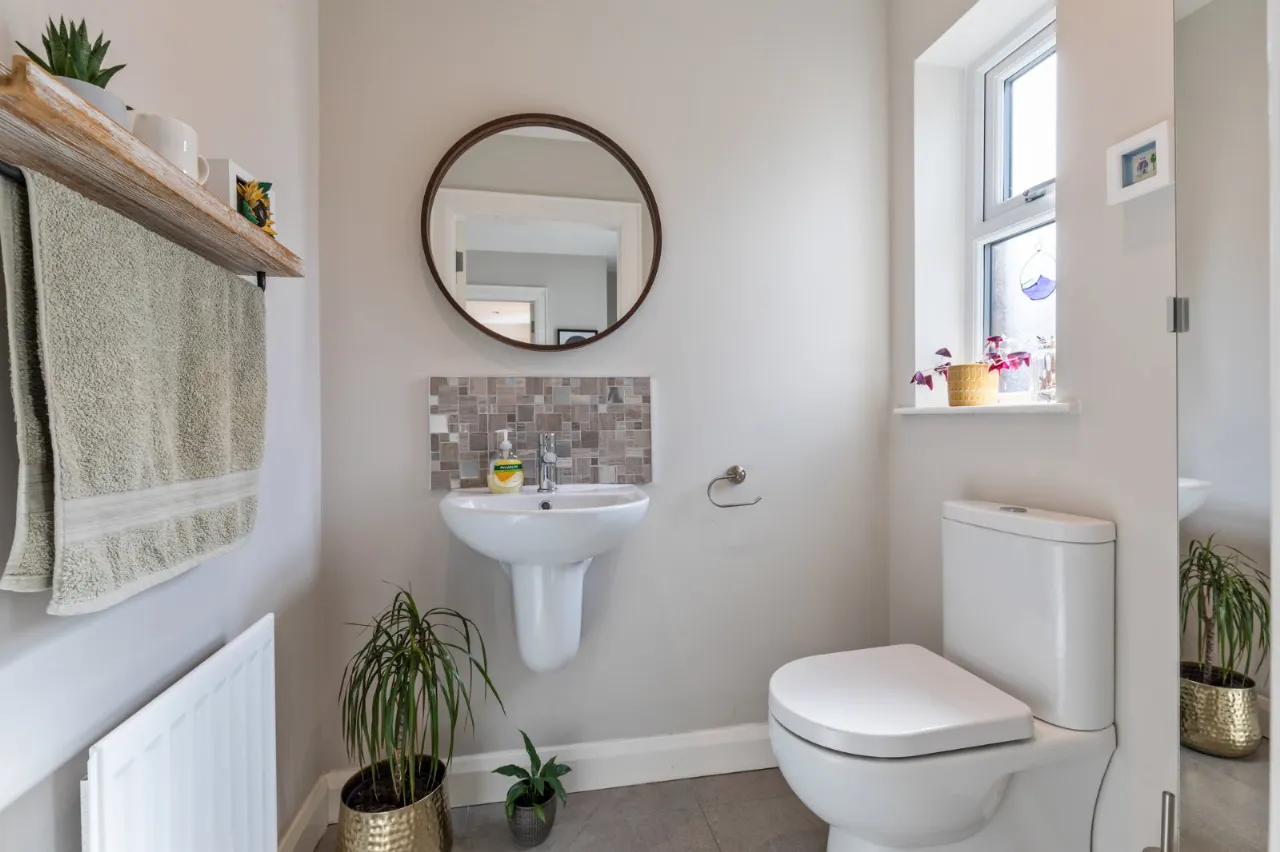 Ceramic tiled floor, pedestal wash hand basin, low flush WC, spotlighting, extractor fan
