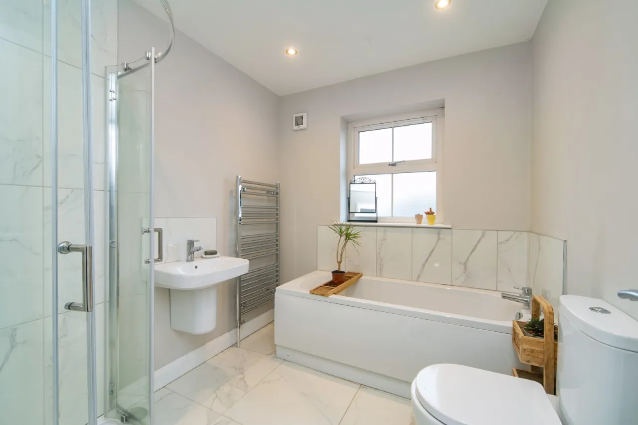 Modern suite comprising WC, panelled bath with mixer taps, wash hand basin, corner shower cubicle and extractor fan