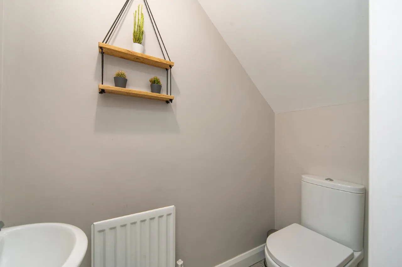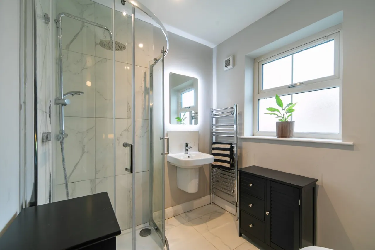White suite comprising WC, wash hand basin, corner shower cubicle, heated towel rail and extractor fan