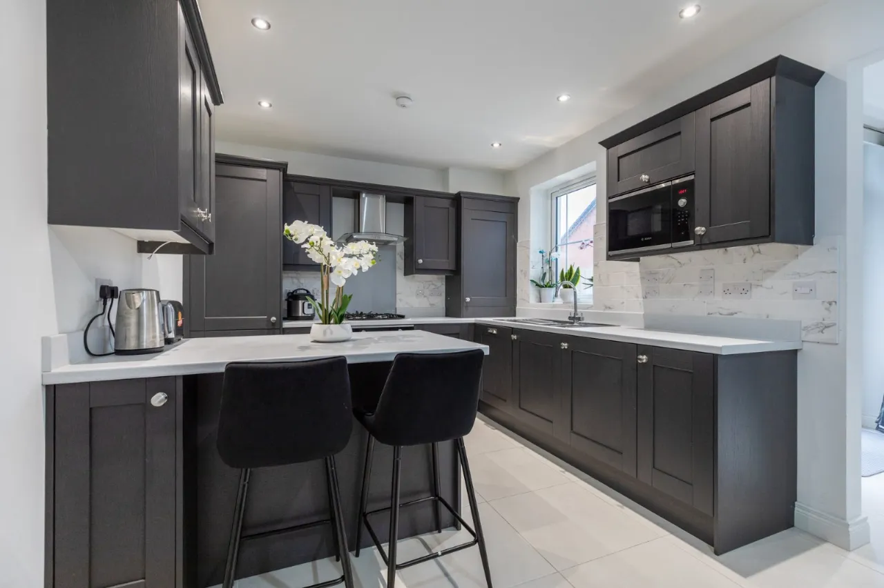 Spotlighting, range of high and low level units, integrated fridge freezer, 1.5 bowl stainless steel sink unit, integrated washing machine, integrated dishwasher, 4 ring gas hob, stainless steel extractor fan, Worchester gas boiler