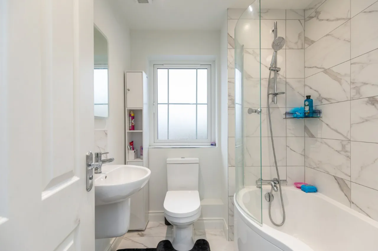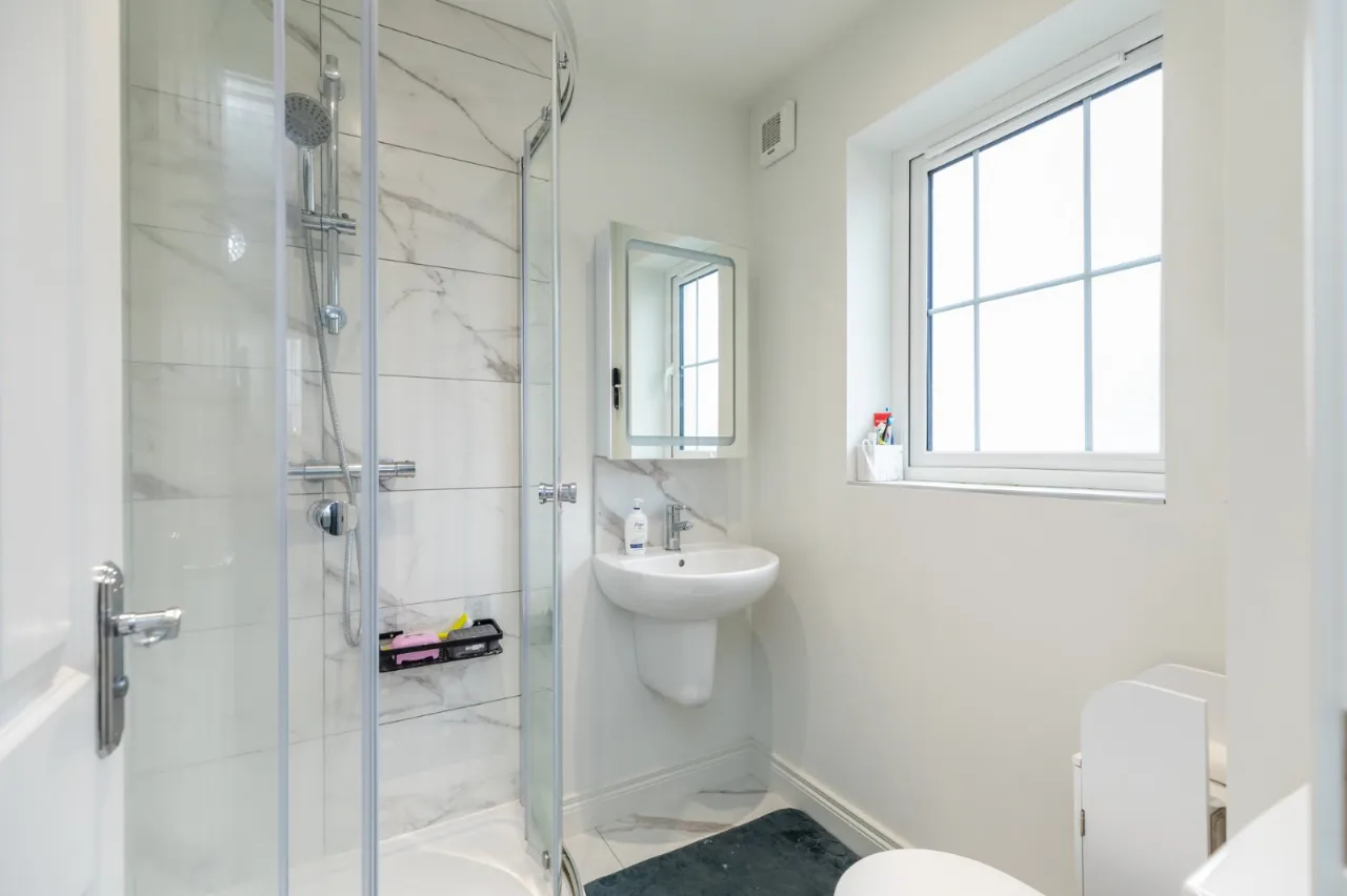 Tiled floor, low flush WC, pedestal wash hand basin, fully tiled corner shower cubicle with rain head shower, chrome heated towel radiator, extractor fan