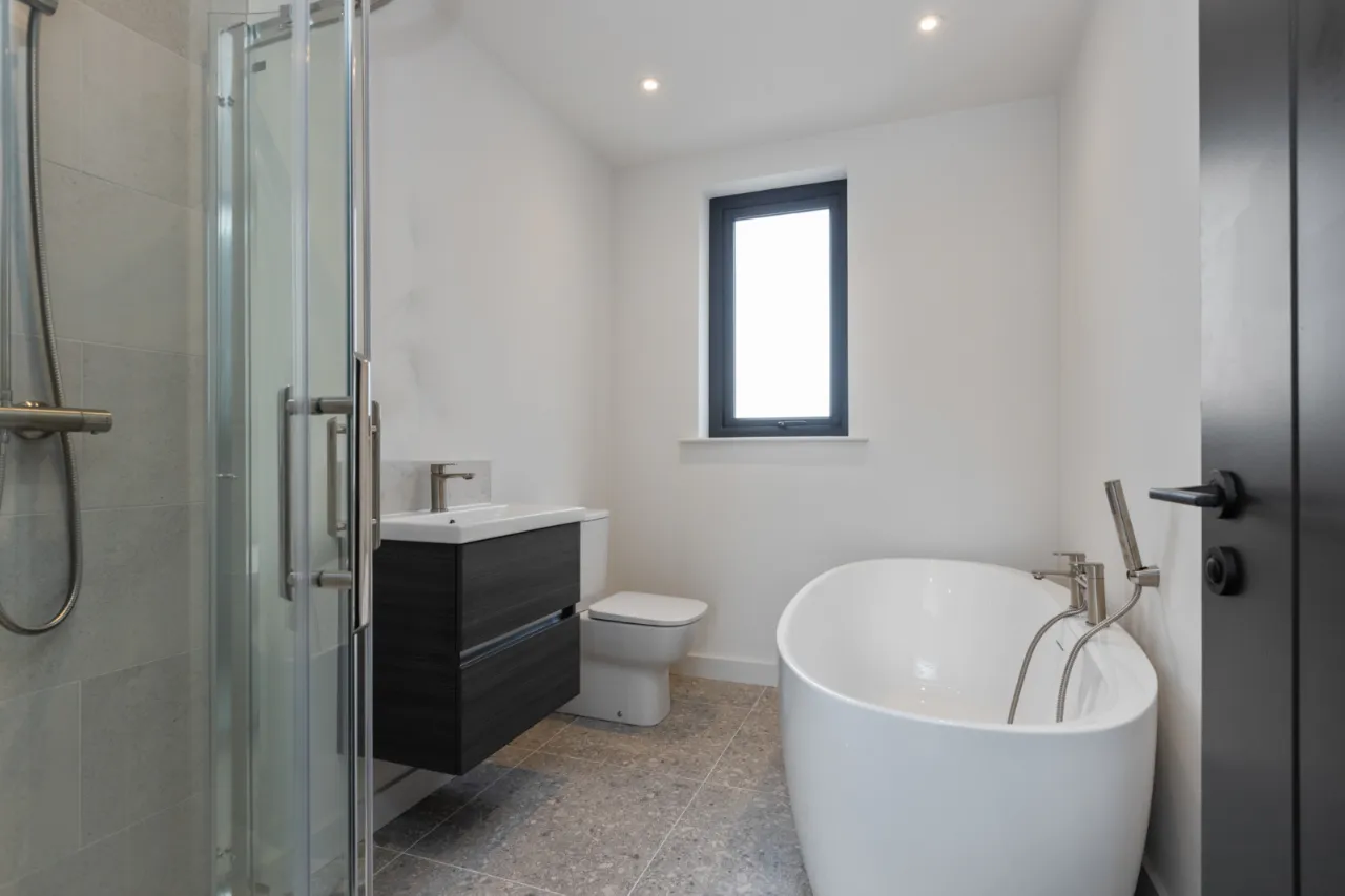 Tiles to bathroom floors, showers and splash backs. Tiles to cloakroom and utility floors (where applicable)