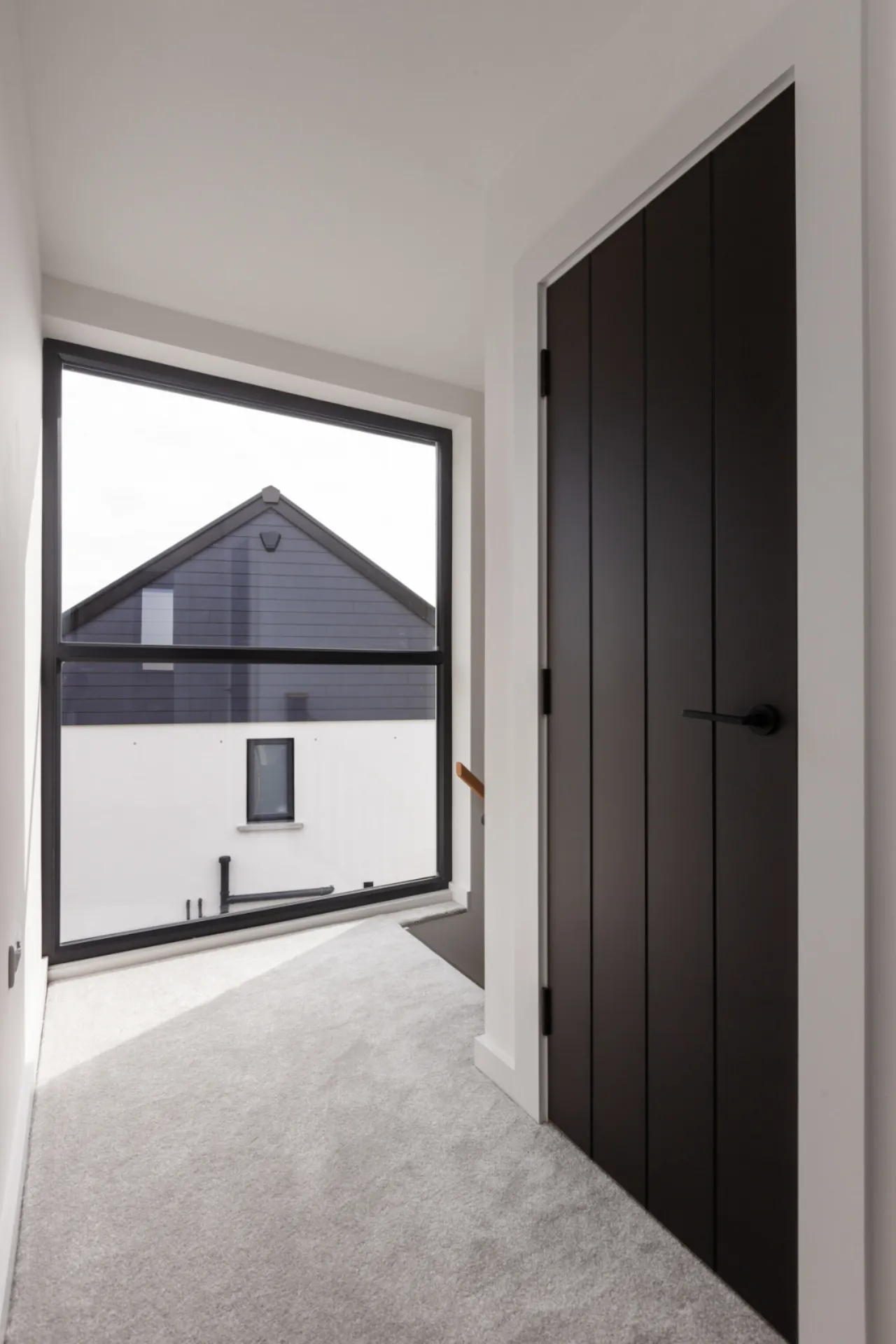 A mixture of white render, grey brick and timber effect maintenance free cladding