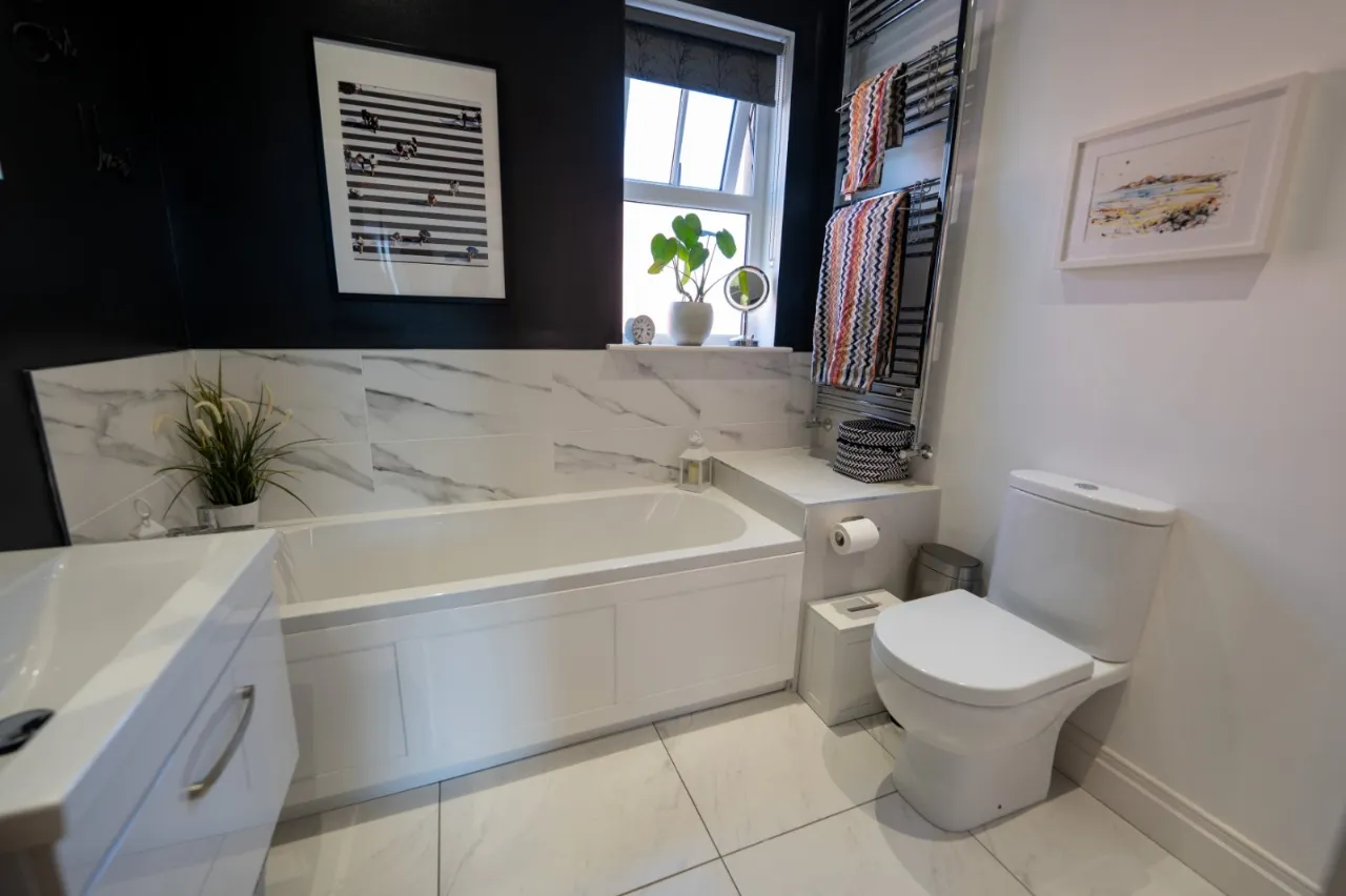 Low flush WC. Pedestal wash hand basin in vanity unit. Bath with tiled surround. Fully tiled shower cubicle. Low voltage lighting. Extractor fan. Ceramic tiled floor.
