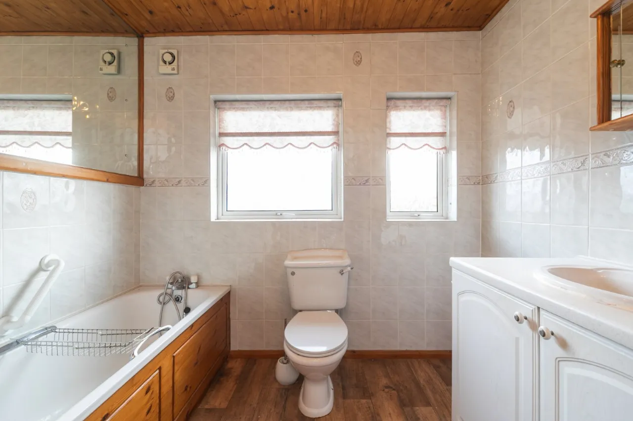 White suite comprising: Panelled bath with mixer taps and thermostatic shower fitting, low flush WC, vanity sink unit with mixer taps, fully tiled walls, chrome towel radiator.
