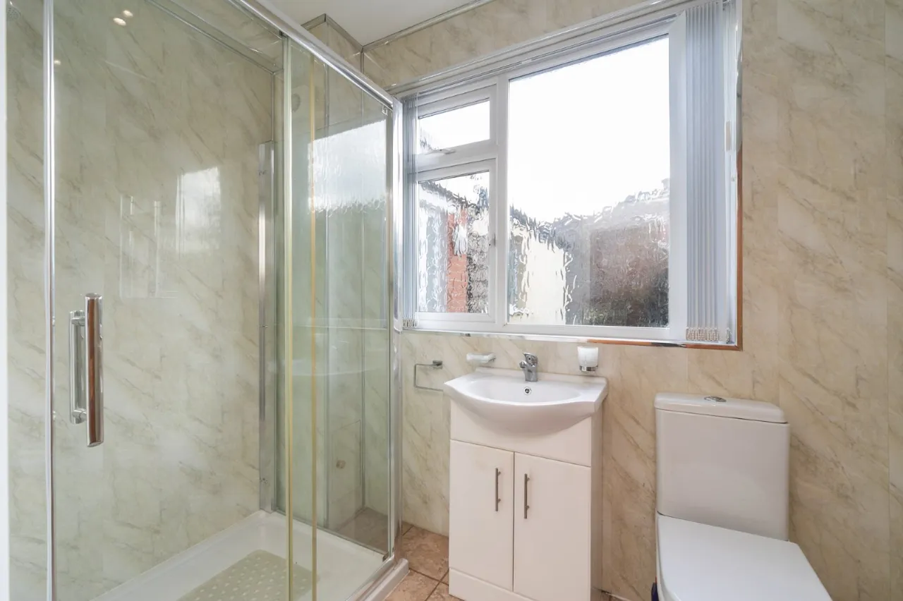 Fully tiled shower cubicle, vanity sink unit, low flush WC, ceramic tiled floor, chrome towel radiator.