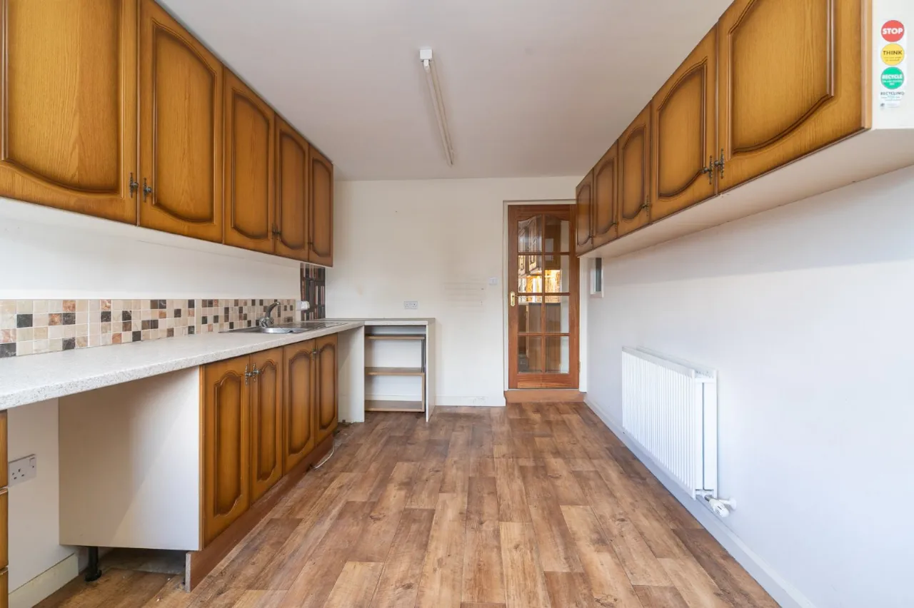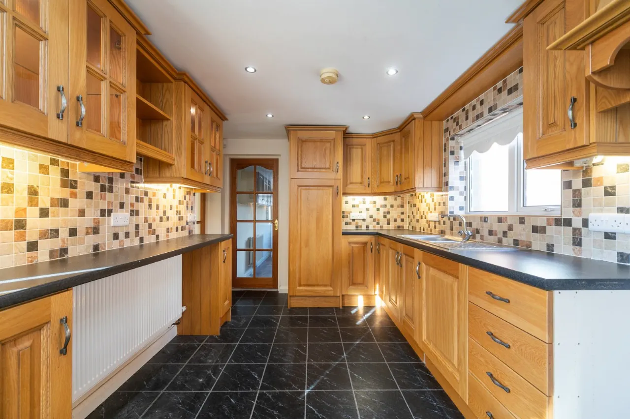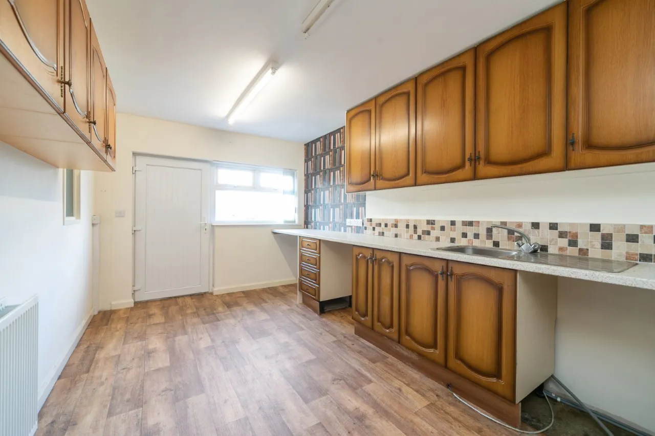 Full range of high and low level units, stainless steel single drainer sink unit, ceramic tiled floor, partly tiled walls.