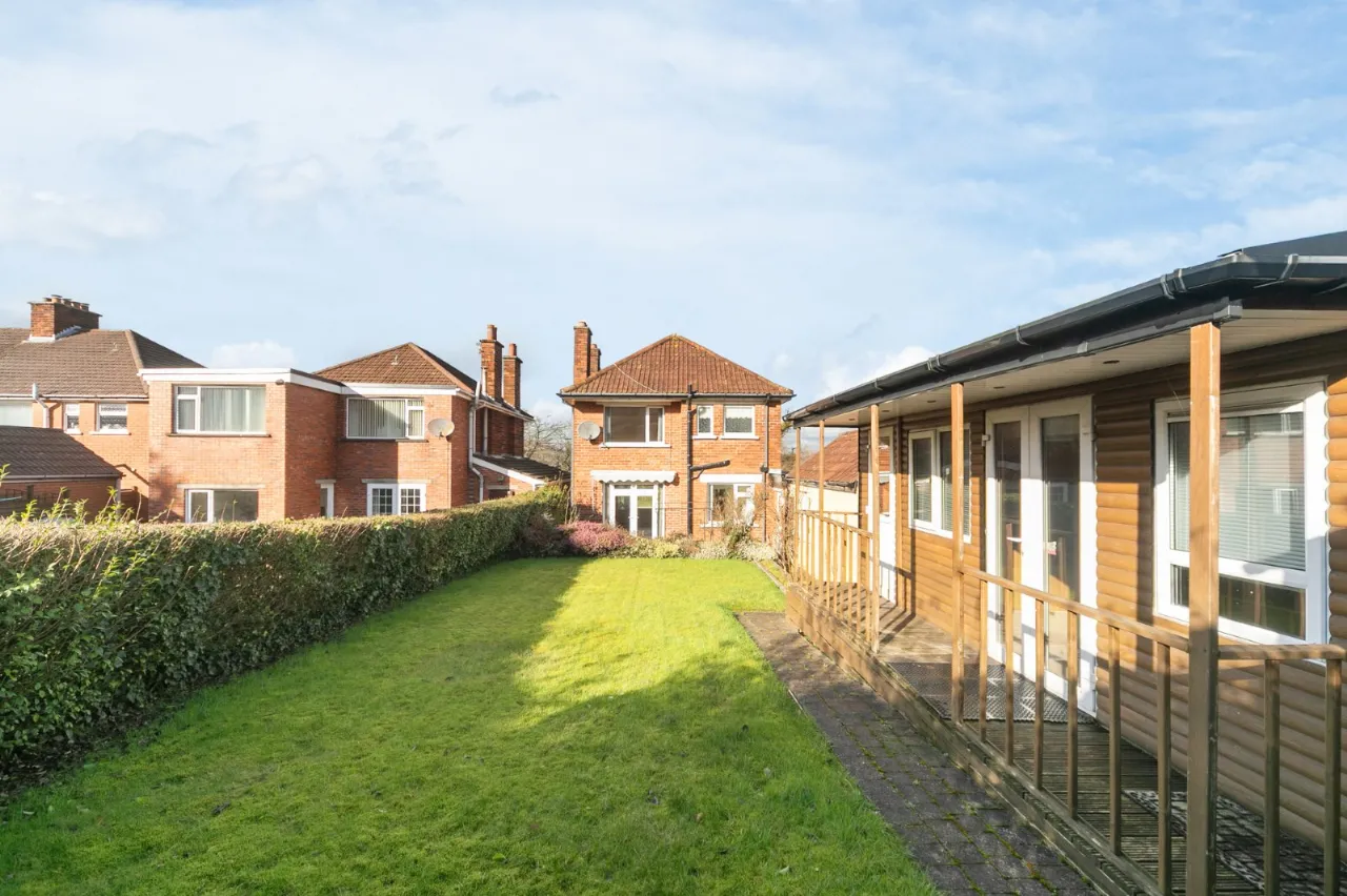 To the rear is a paved patio leading to a garden.