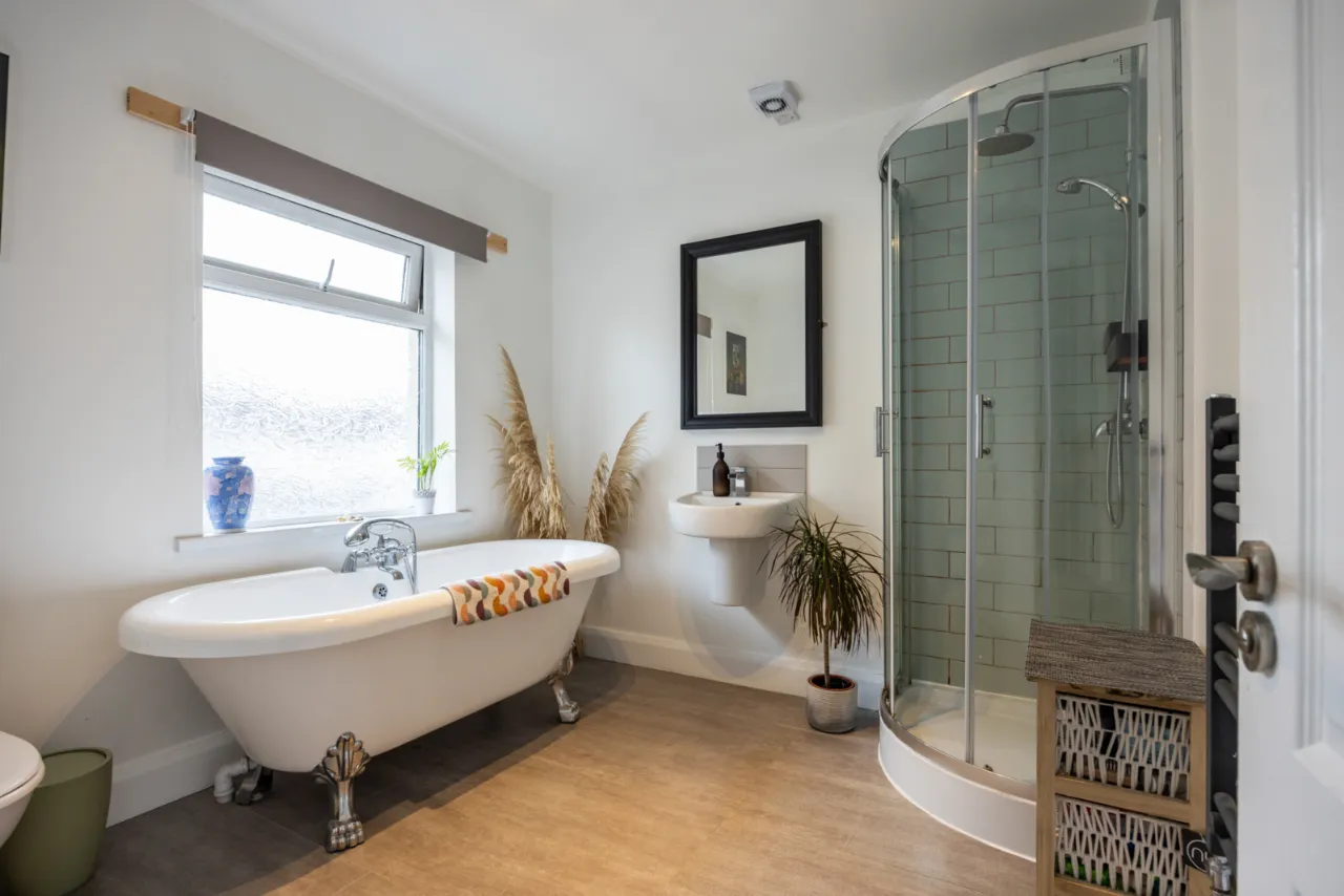 White suite comprising: Oval bath with mixer taps and shower fitting, semi pedestal wash hand basin with mixer taps, low flush WC, fully tiled shower cubicle, overhead rain shower, towel radiator.