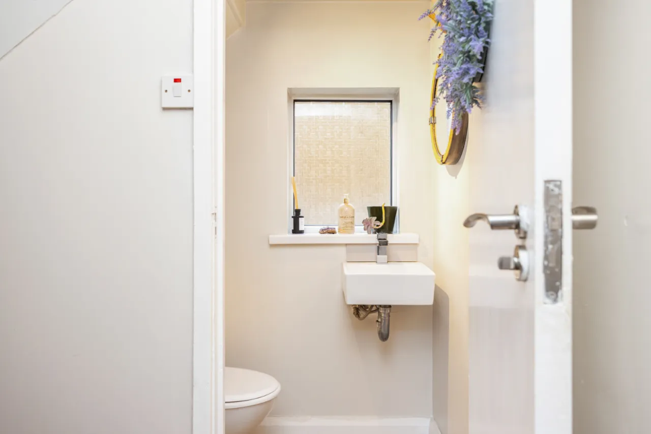 Under stairs storage. Low flush WC, wash hand basin with mixer taps.