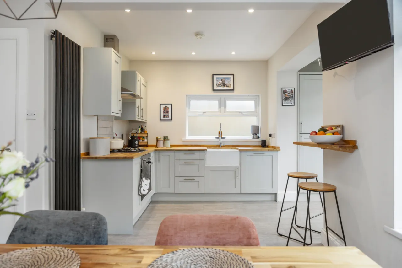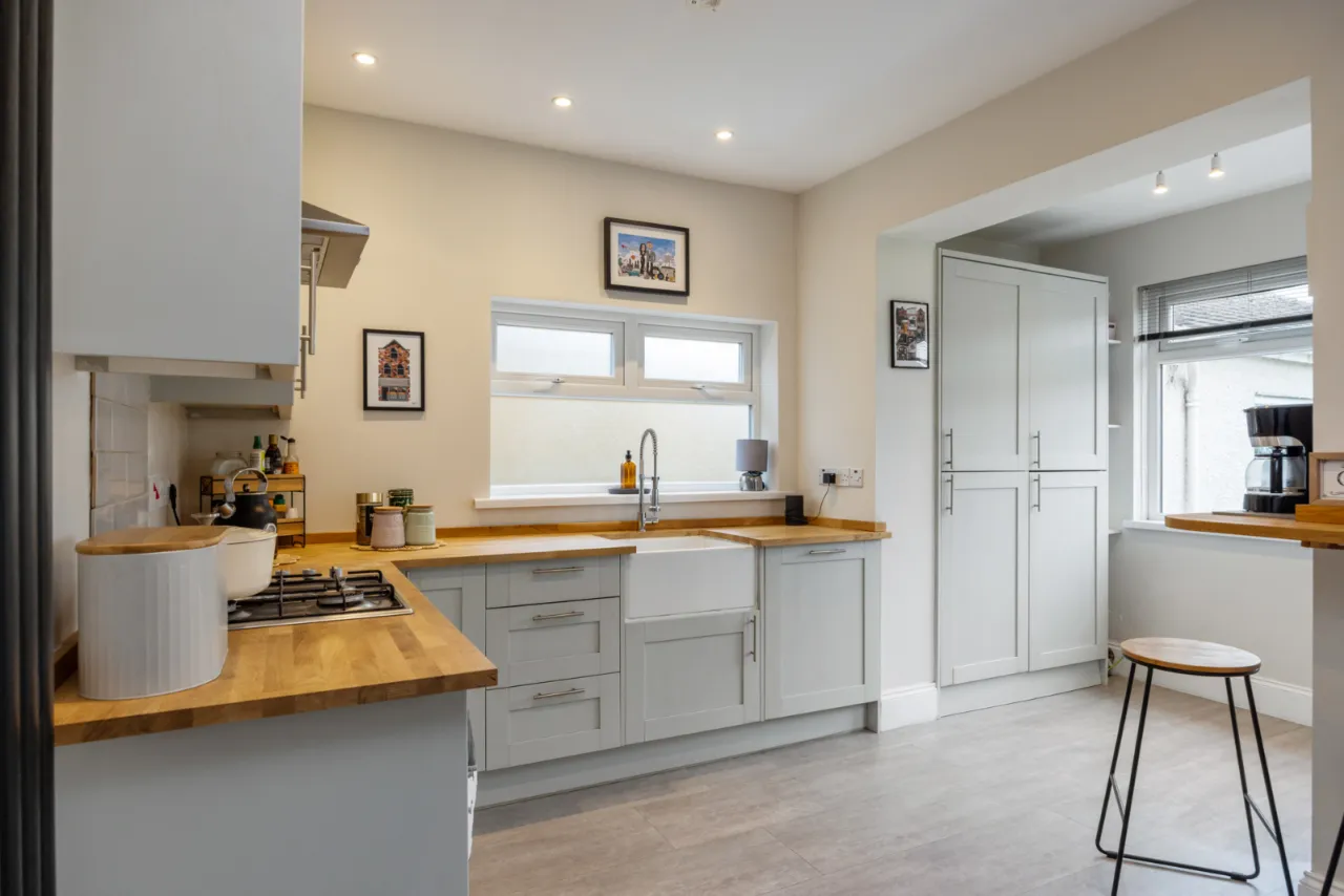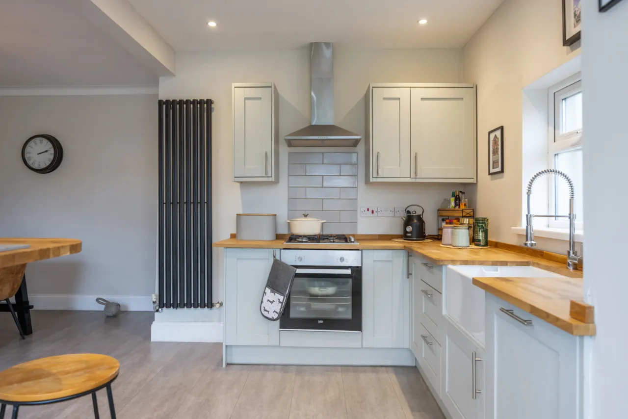 Full range of high and low level units, Belfast sink with mixer taps, built in dishwasher, fridge freezer, plumbed for washing machine, wood laminate floor.