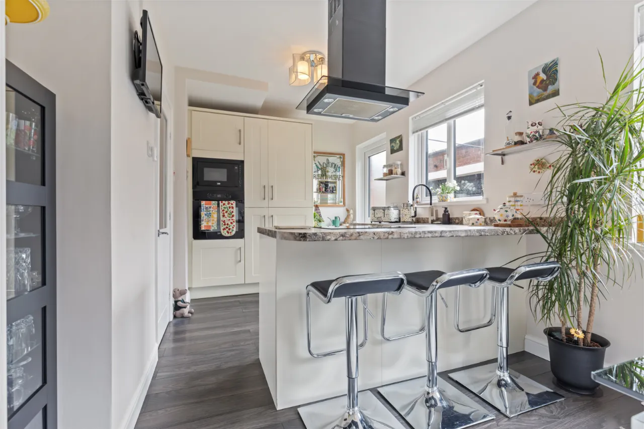 Range of high and low level units, Formica work surfaces with inset stainless steel sink unit and drainer with mixer tap, 1 tub, integrated fridge freezer, integrated oven with integrated microwave above, four ring induction hob with extractor fan above, laminate wood effect flooring, open to dining area, access doors through to rear gardens.