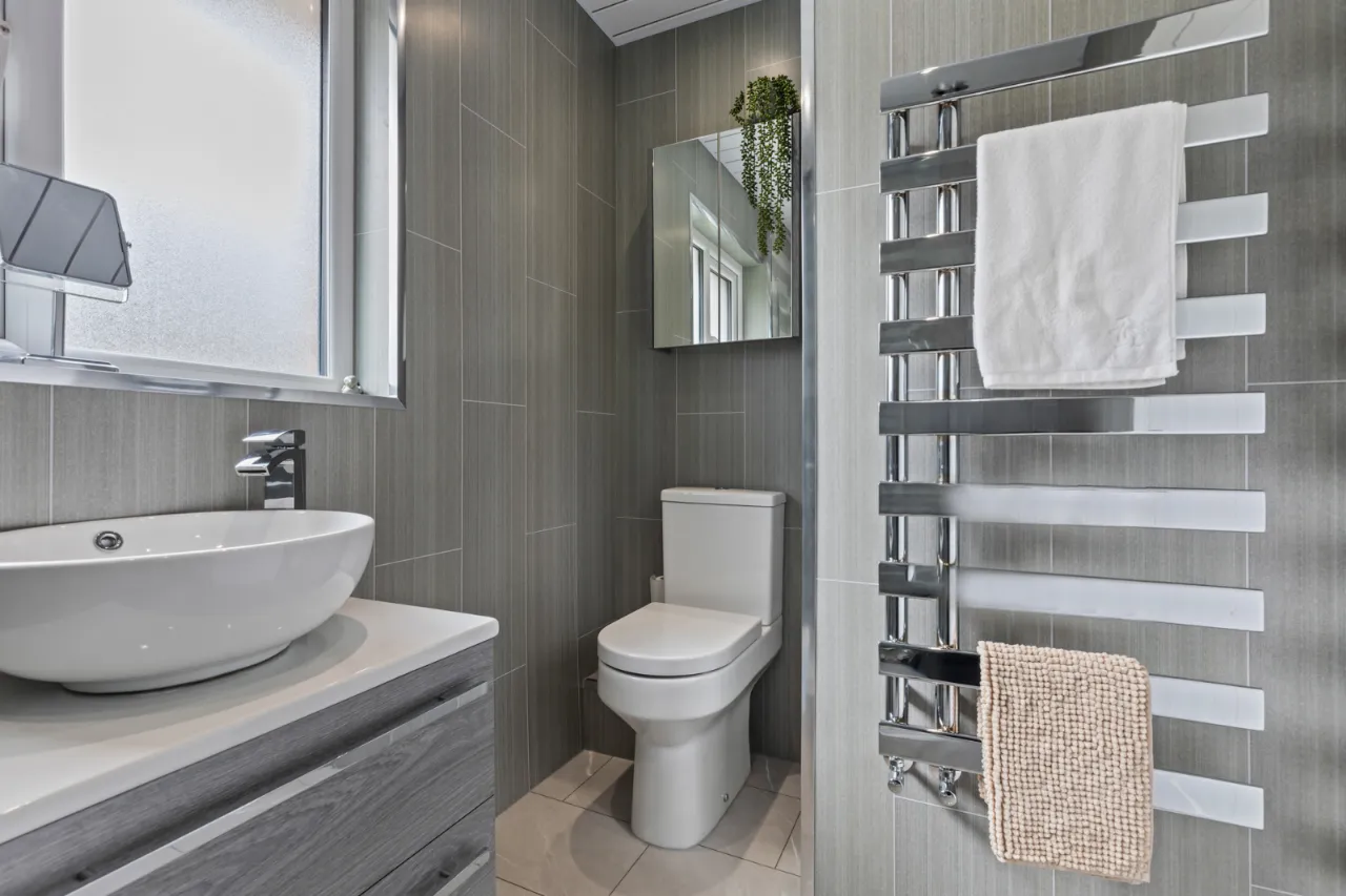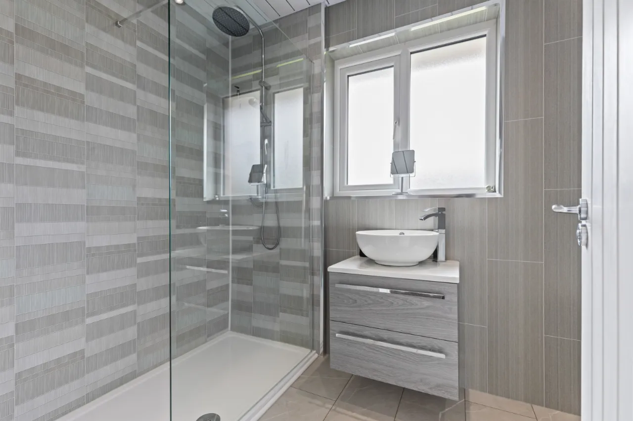 White suite comprising of low flush WC, vanity unit with circular wash hand basin and mixer tap, walk-in thermostatically controlled shower, panelled walls, tiled flooring, recessed spotlighting, extractor fan, vertical chrome heated towel rail.