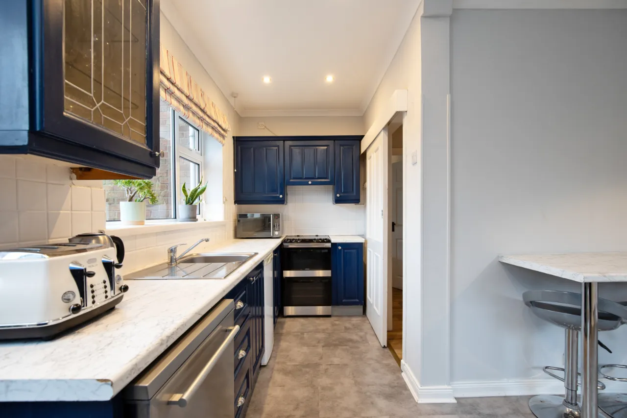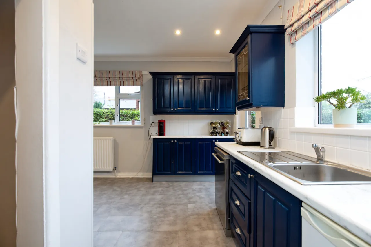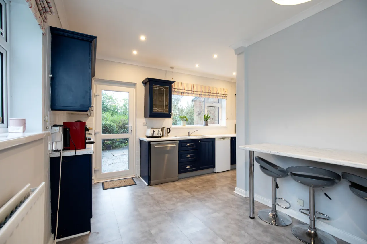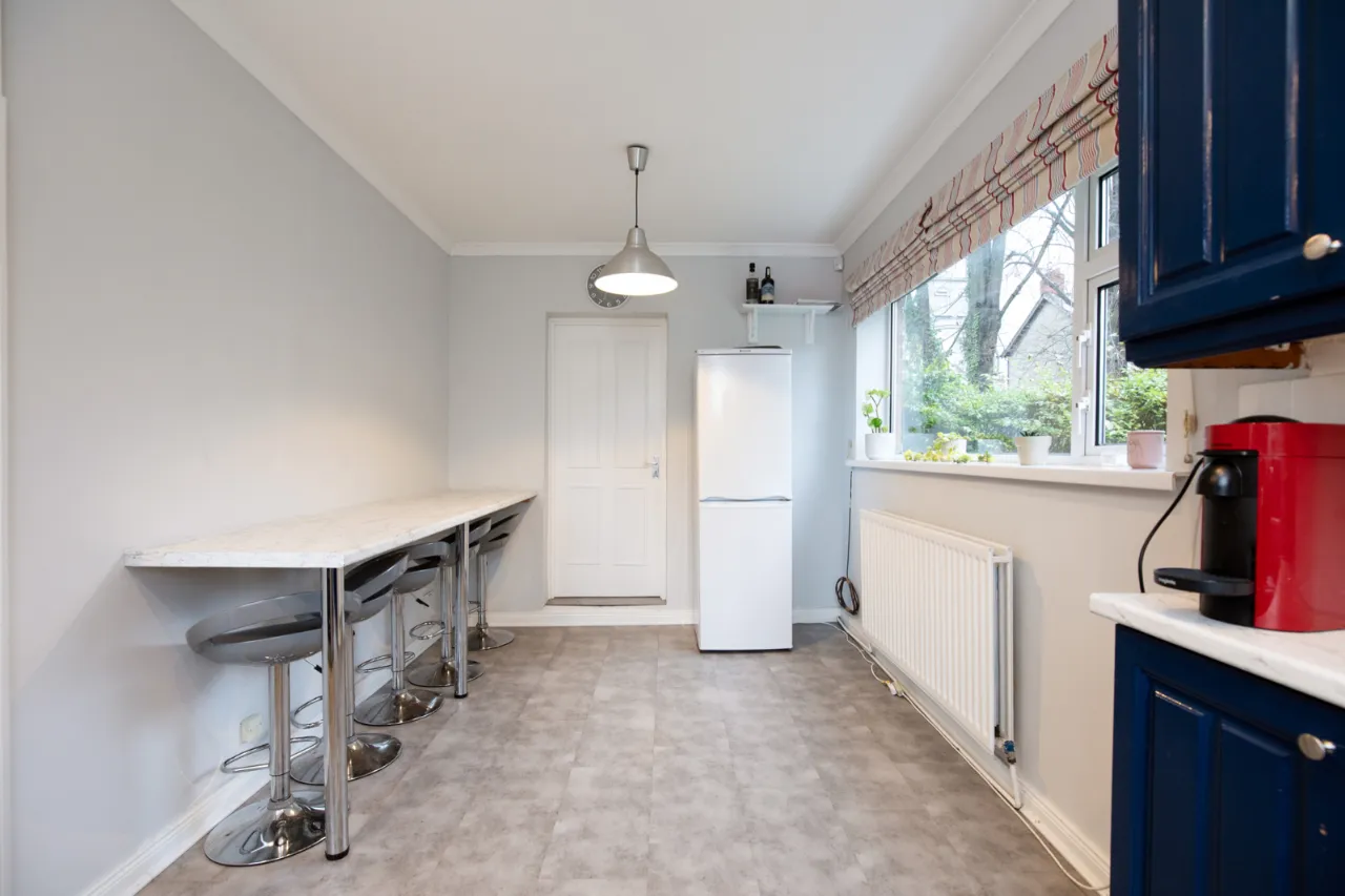Comprises of high and low level wooden units, single bowl sink unit with mixer tap, space for oven, grill and hob. Overhead extractor unit, plumbed for dishwasher, space for under counter fridge, space for American fridge and freezer, partly tiled walls, open plan into formal dining and hosting area. Corniced ceiling, views towards Cavehill, access to rear garden and access to...