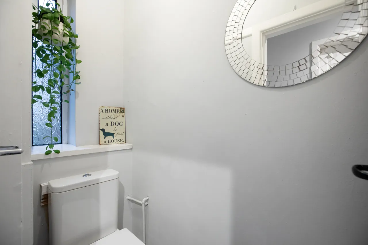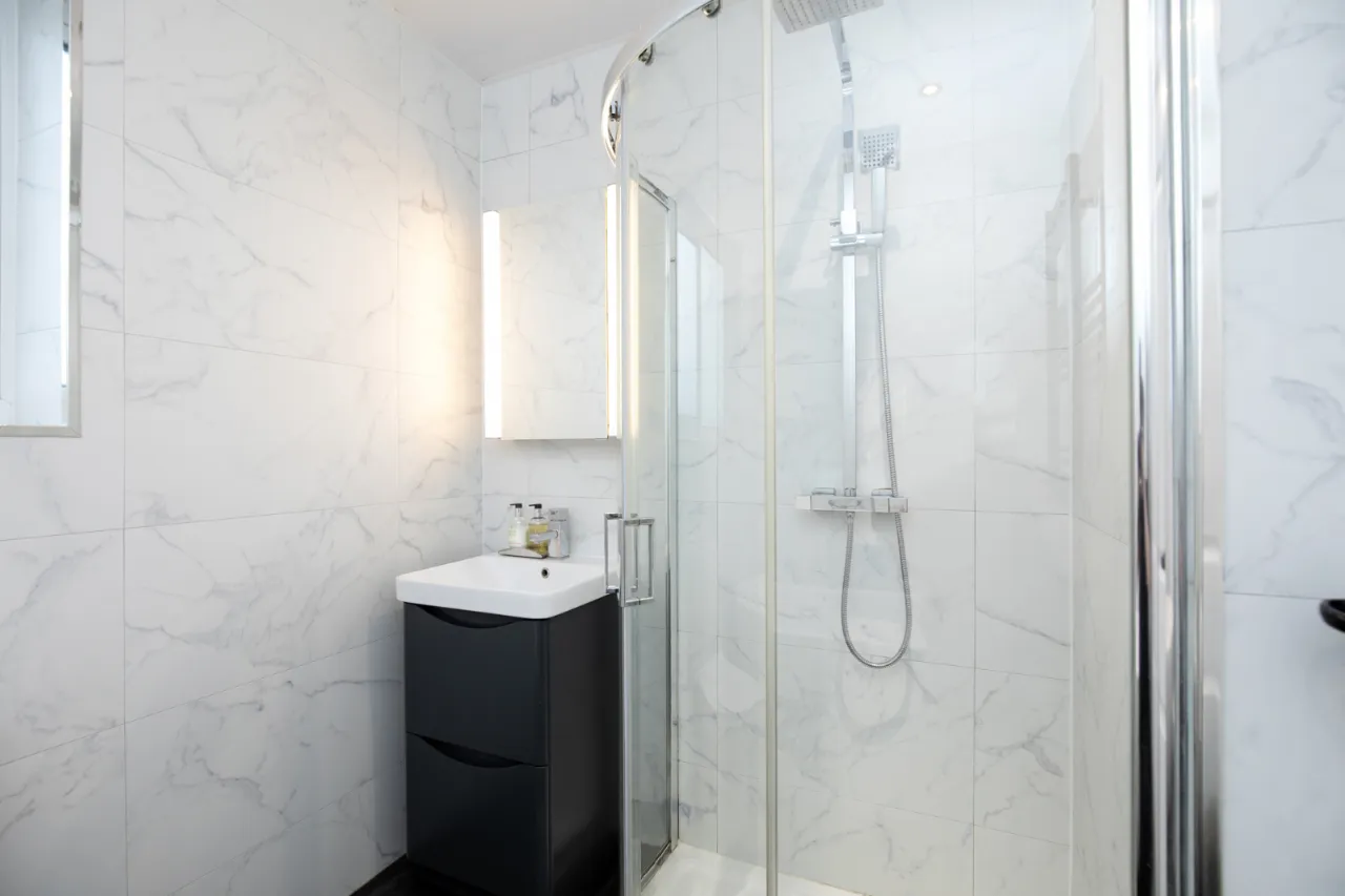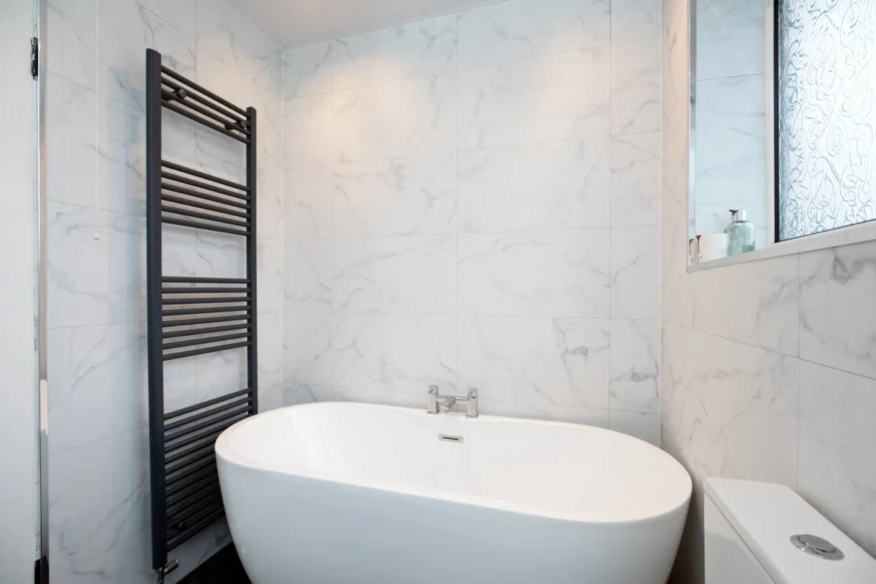 Contemporary bathroom suite comprising of free standing bath with mixer tap, enclosed corner shower unit with shower screen, ceramic bowl sink unit with mixer tap and vanity storage underneath. Low flush WC, recessed lighting, extractor fan and Bluetooth connection for speakers.