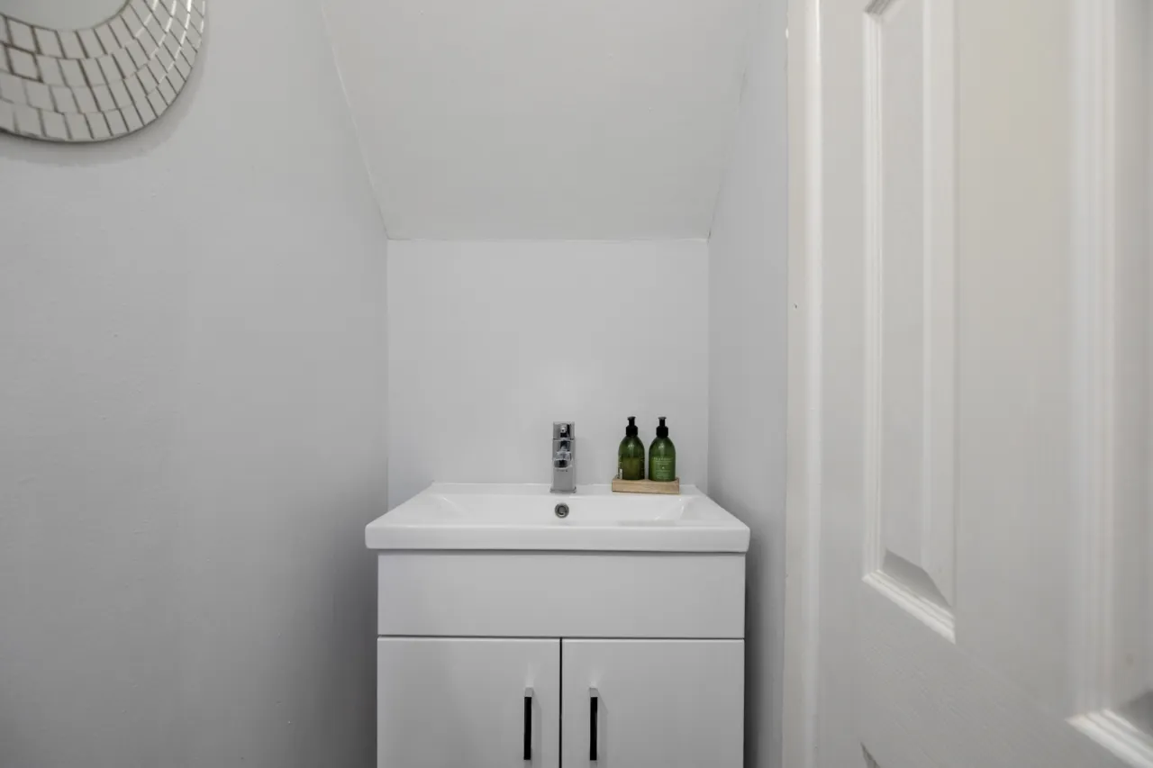Comprises of low flush WC, ceramic bowl sink unit with mixer tap and vanity storage underneath.