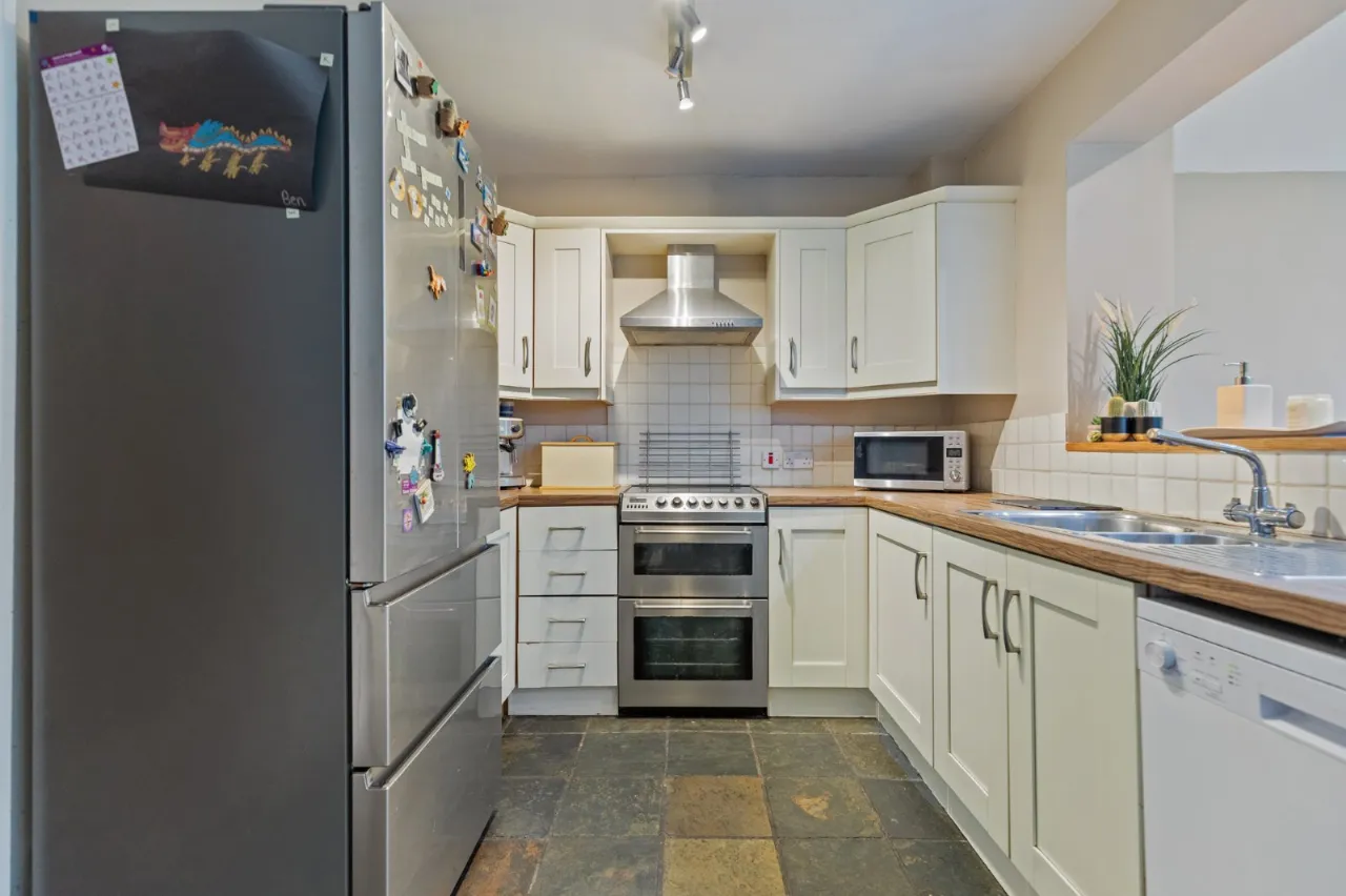 Full range of high and low level units, stainless steel single drainer sink unit with mixer taps, recess for cooker, plumbed for dishwasher, open to: