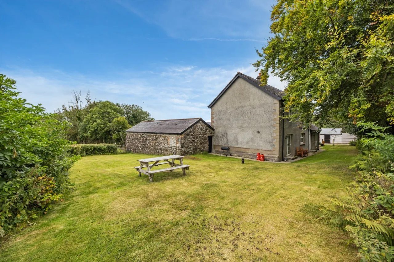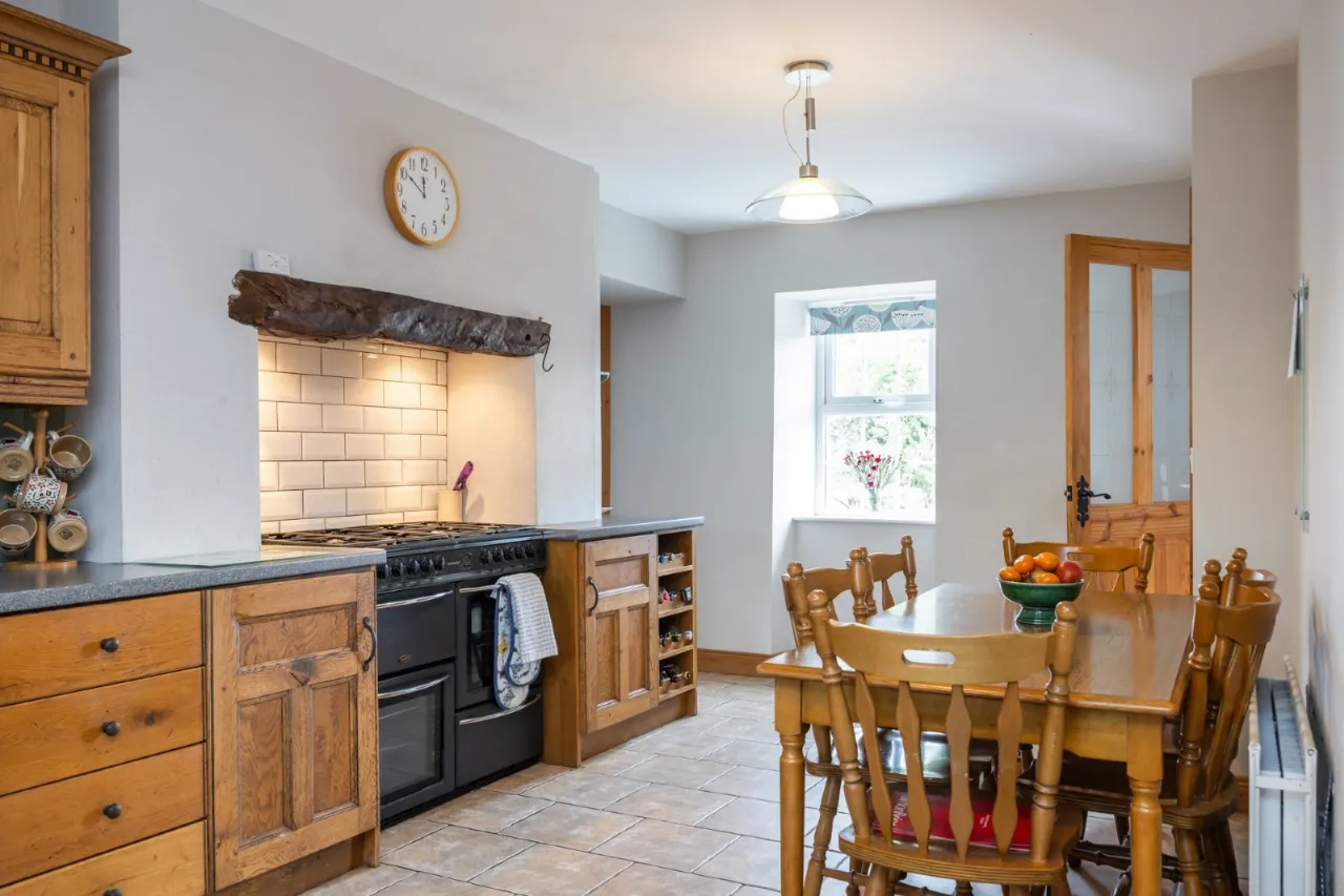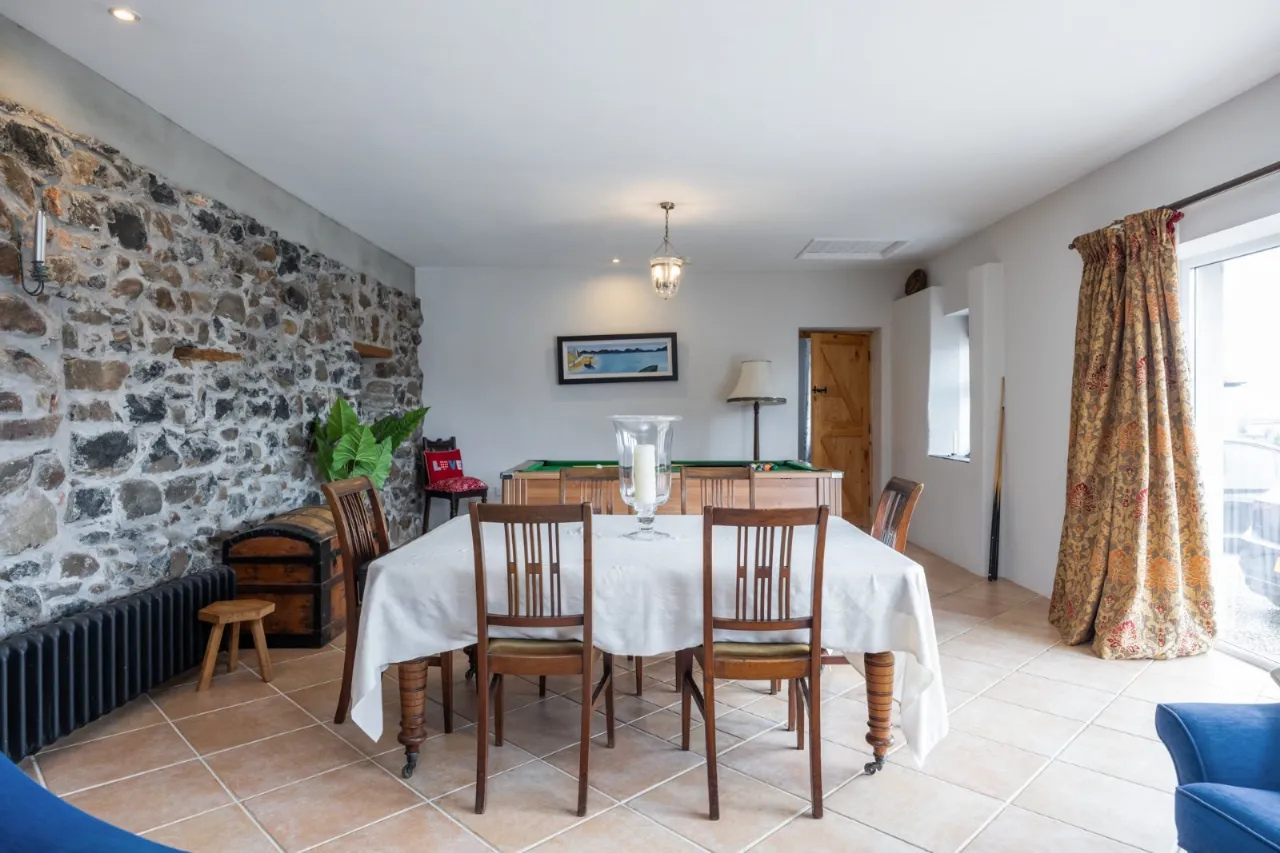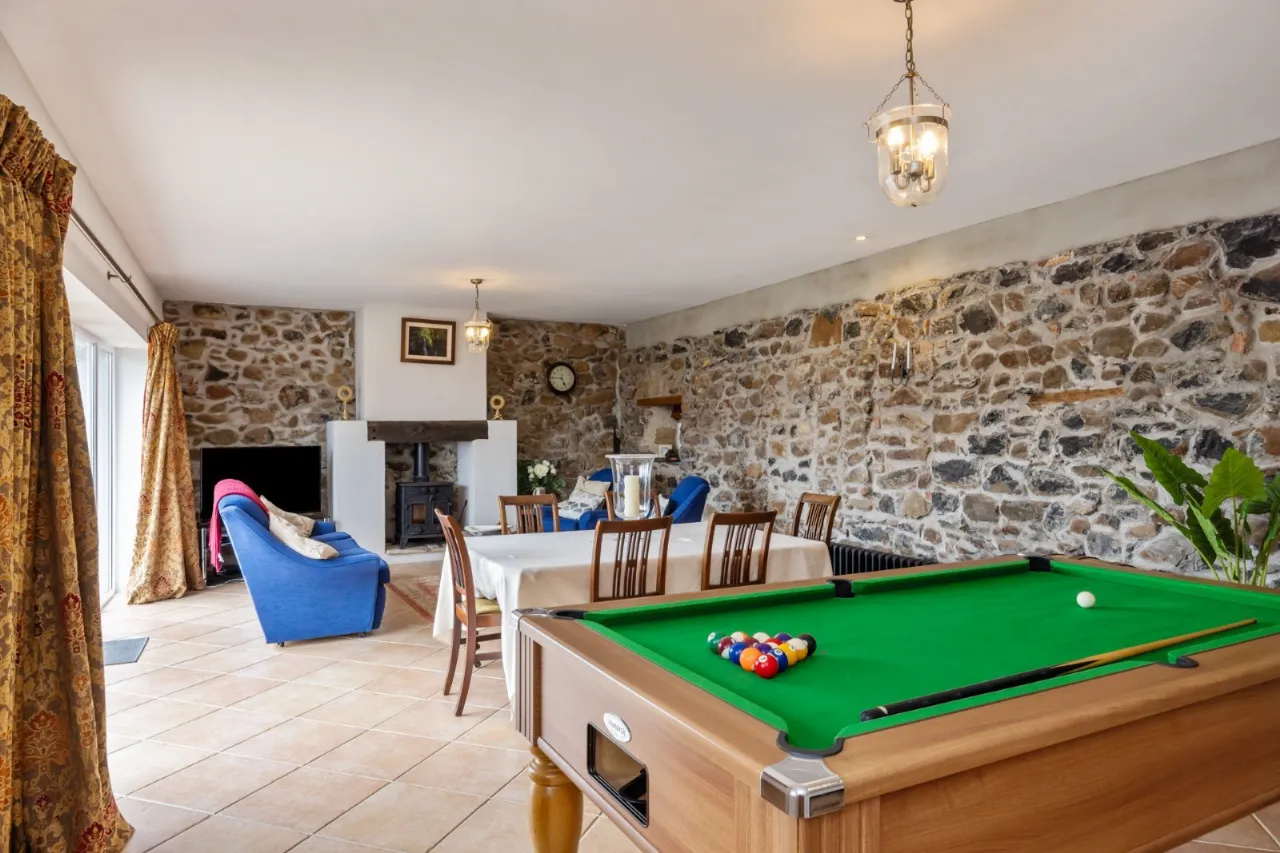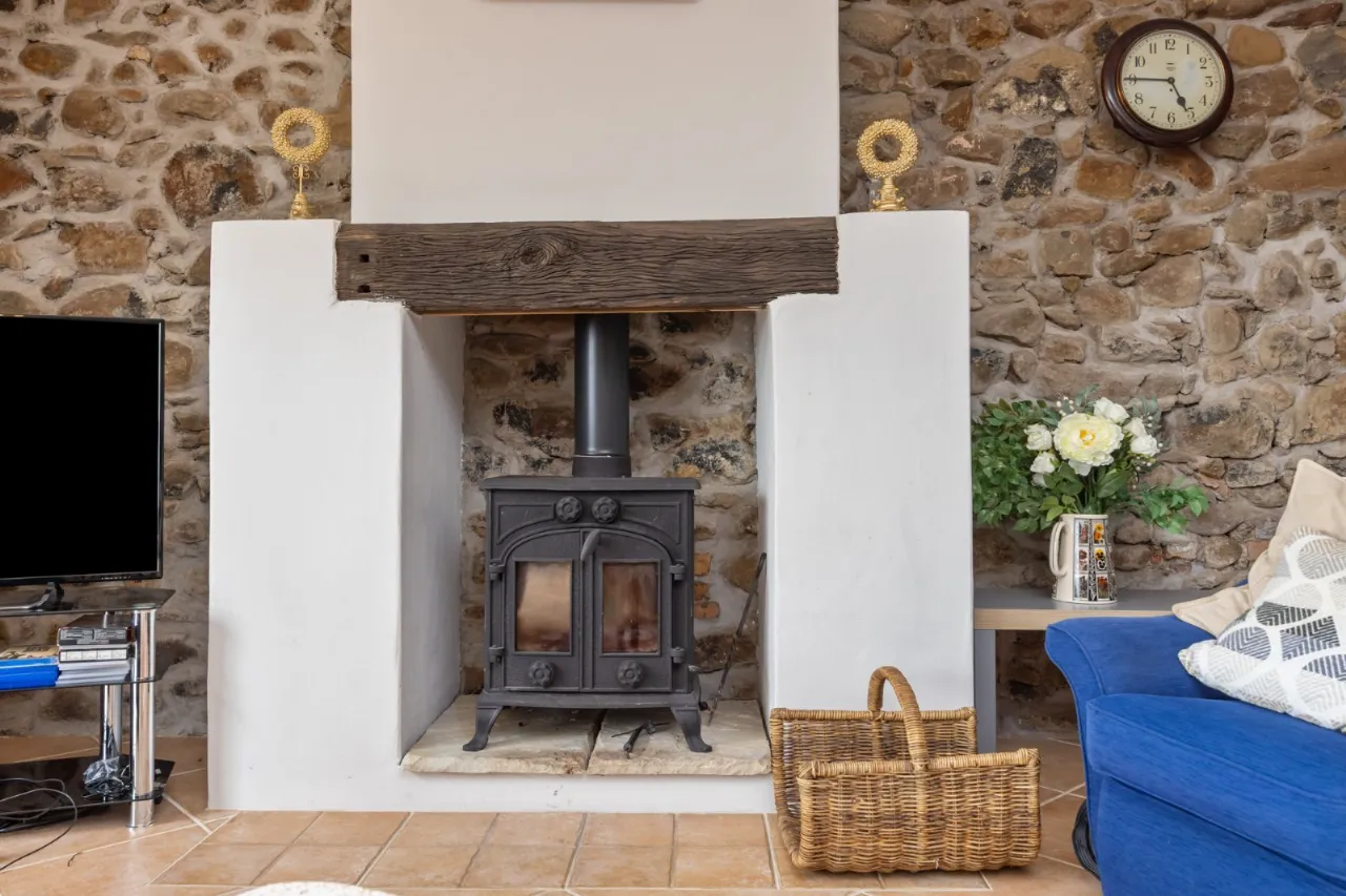 Feature Stone Wall, ceramic tiled floor, double upvc doors to patio, wood burning stove with solid wood beam