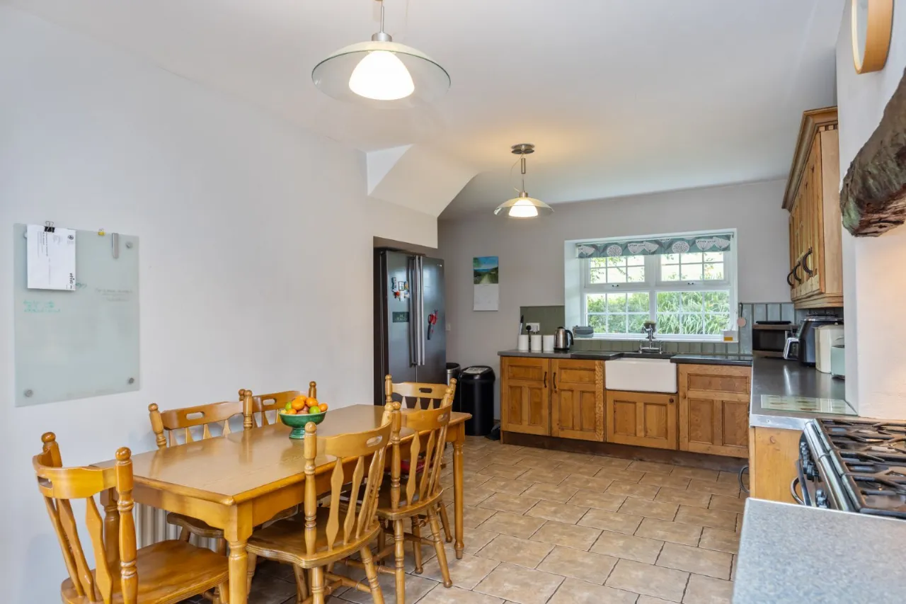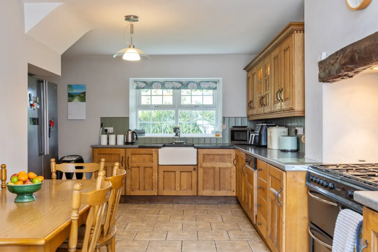 Ceramic tiled floor, range of high and low level units, space for American fridge freezer, range style Belling Cooker with double oven, part tiled walls, Belfast sink
