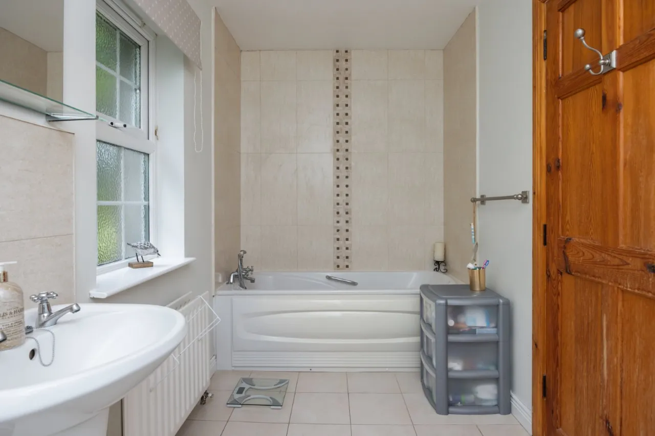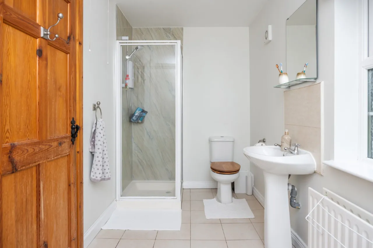 Low flush WC, pedestal wash hand basin, bath with telephone hand shower, shower cubicle with electric shower