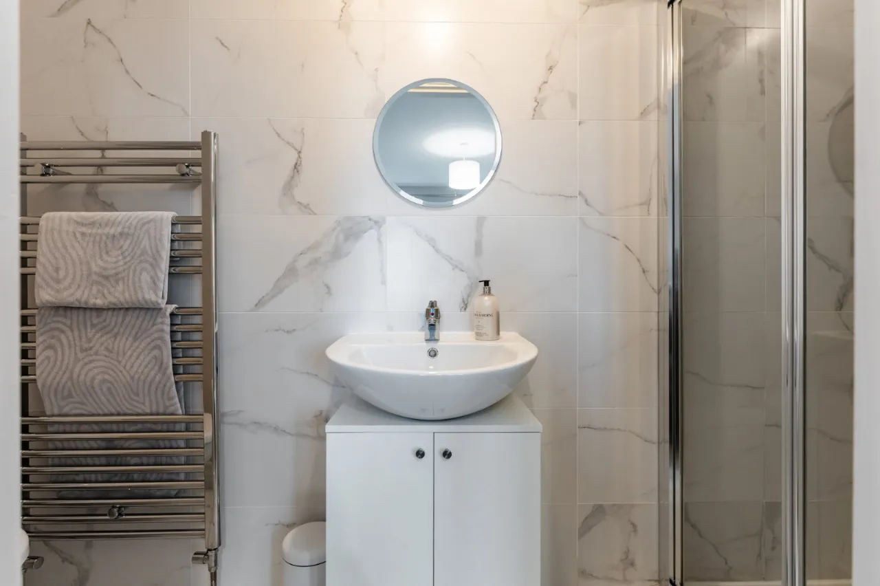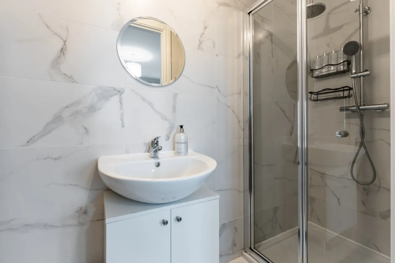 Modern white suite comprising: Large separate fully tiled shower cubicle with thermostatically controlled shower, rain head and telephone hand shower, wall mounted wash hand bsin with mixer taps, push button WC, feature marble effect wall andfloor tiling, chrome towel radiator, extractor fan.