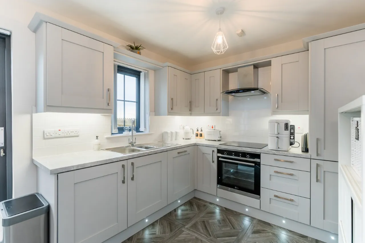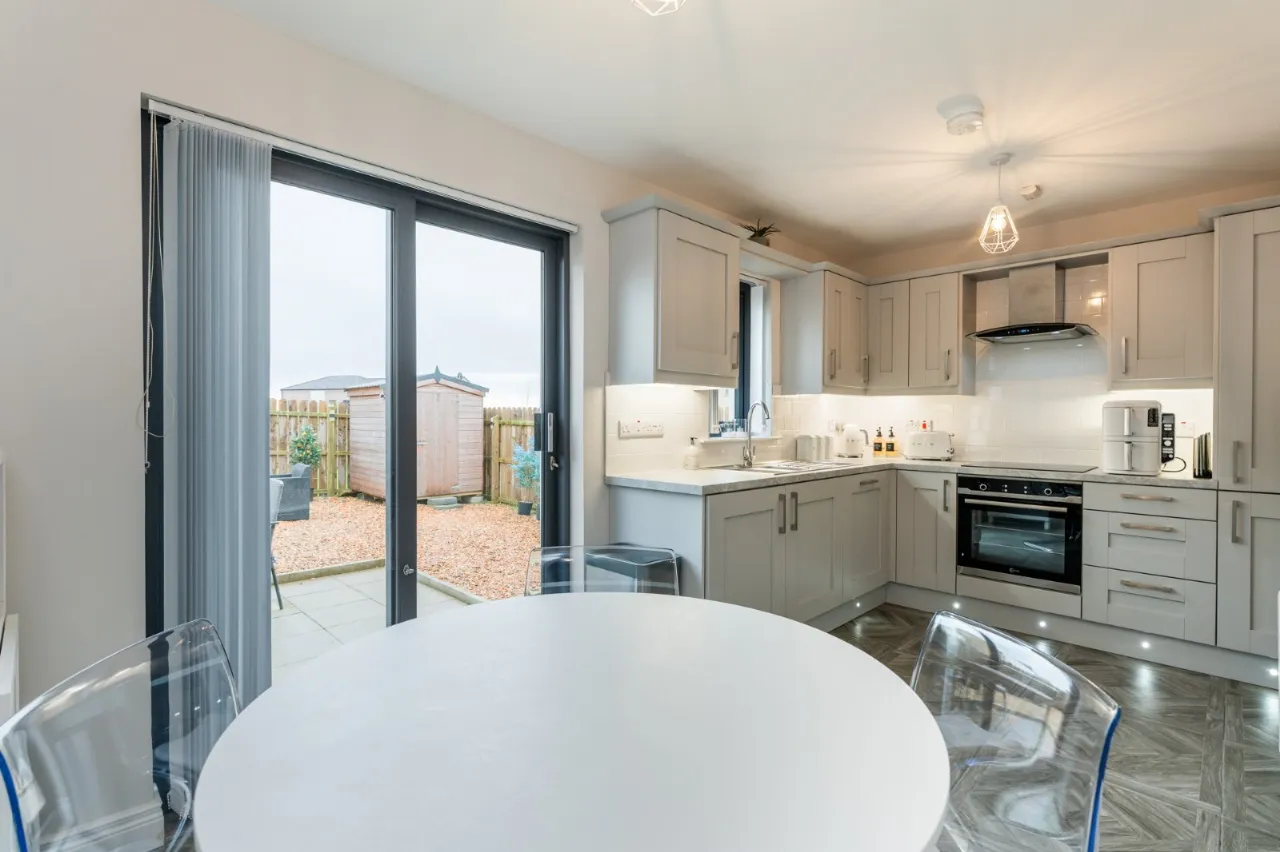 1.5 tub single drainer stainless steel sink unit with mixer taps, range of high and low level light grey shaker style units, marble effect Formica roll edge work surfaces, 4 ring ceramic hob unit, built in oven, stainless steel extractor hood, integrated fridge freezer, dishwasher and washing machine, concealed lighting, feature tiled floor, double glazed sliding patio doors to rear enclosed garden.
