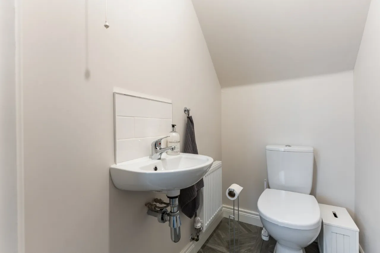 Modern white suite comprising: wall mounted wash hand basin with mixer taps, push button WC, feature tiled floor, extractor fan.