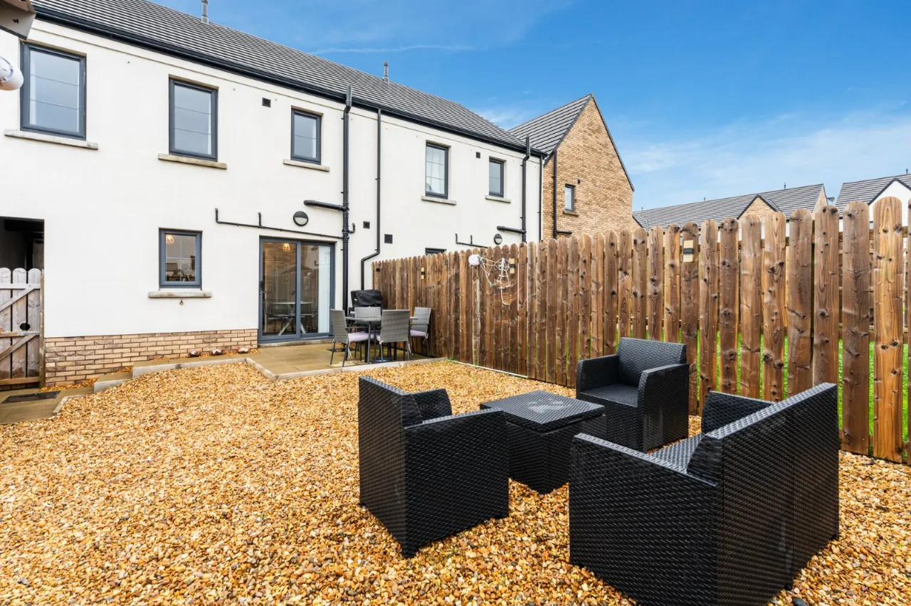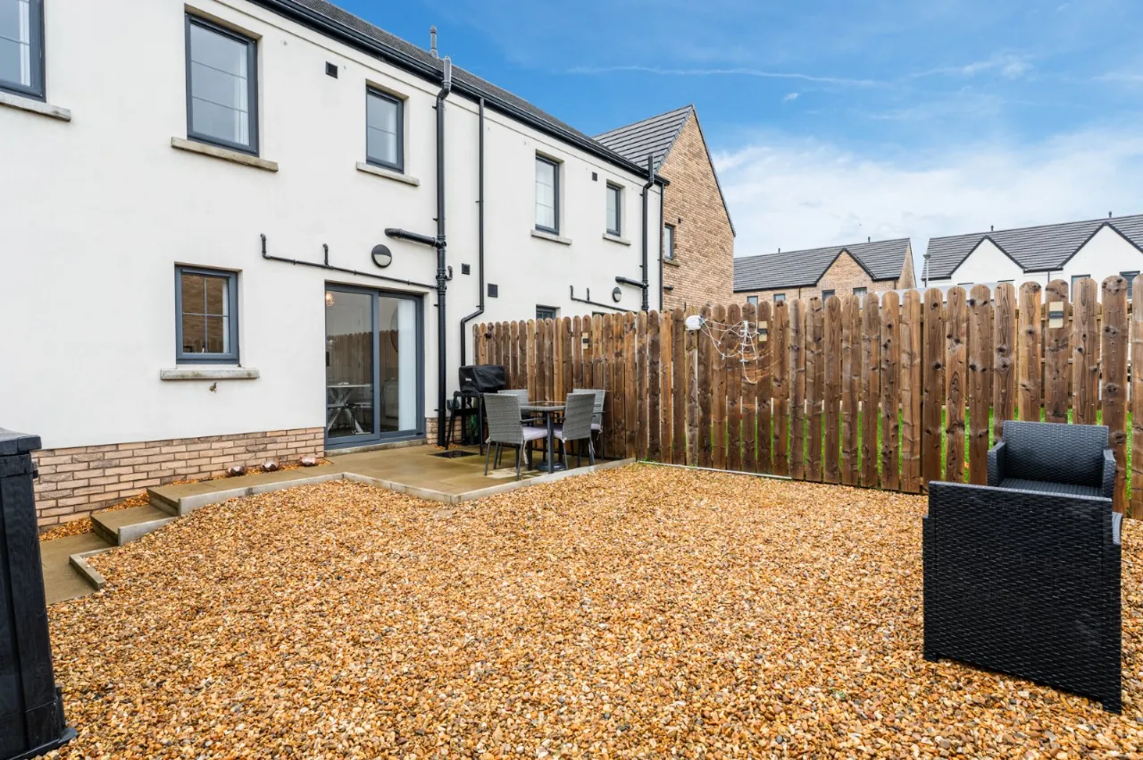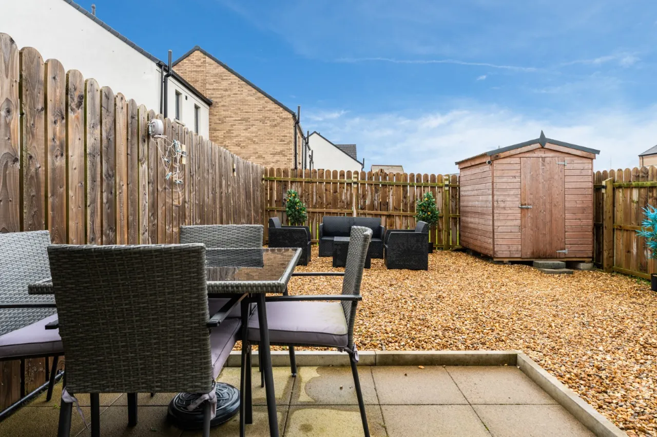 Gardens to front in pebble covered flowerbed and paved path in enclosed garden laid out in modern paved patio and path, large pebble covered patio ideal for family get togethers, garden shed, fening, outside light, outside water tap, access to side for pedestrians.