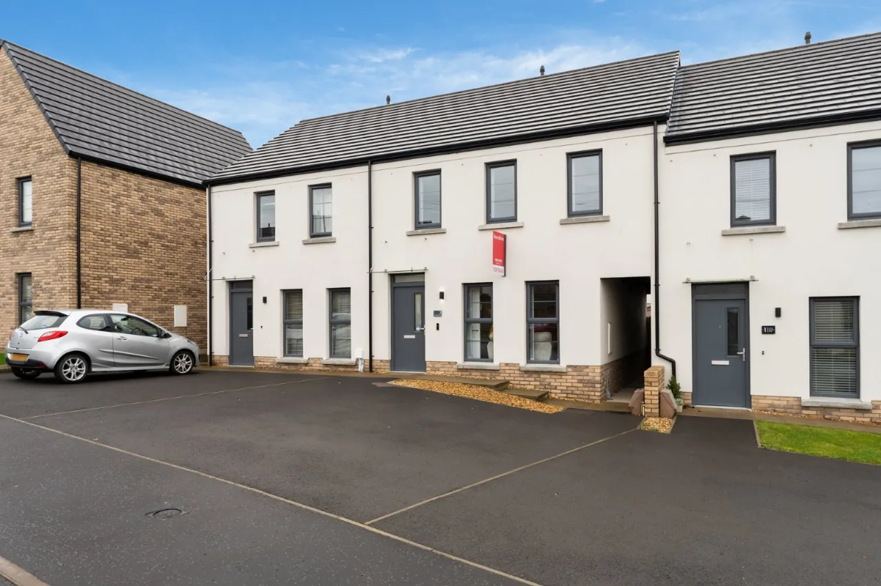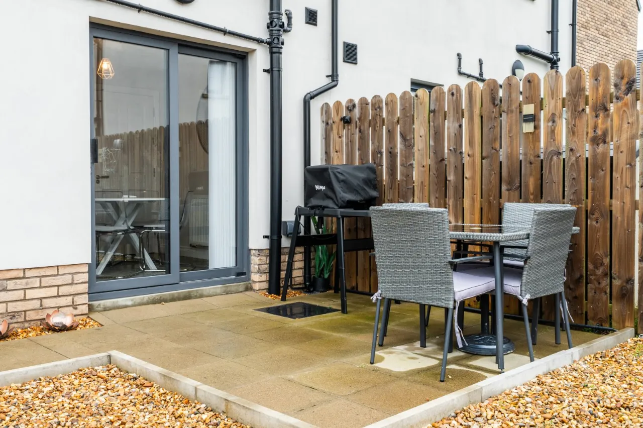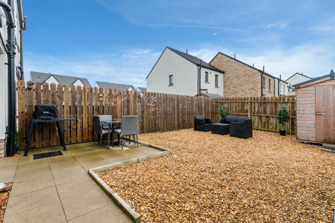Gardens to front in pebble covered flowerbed and paved path in enclosed garden laid out in modern paved patio and path, large pebble covered patio ideal for family get togethers, garden shed, fening, outside light, outside water tap, access to side for pedestrians.