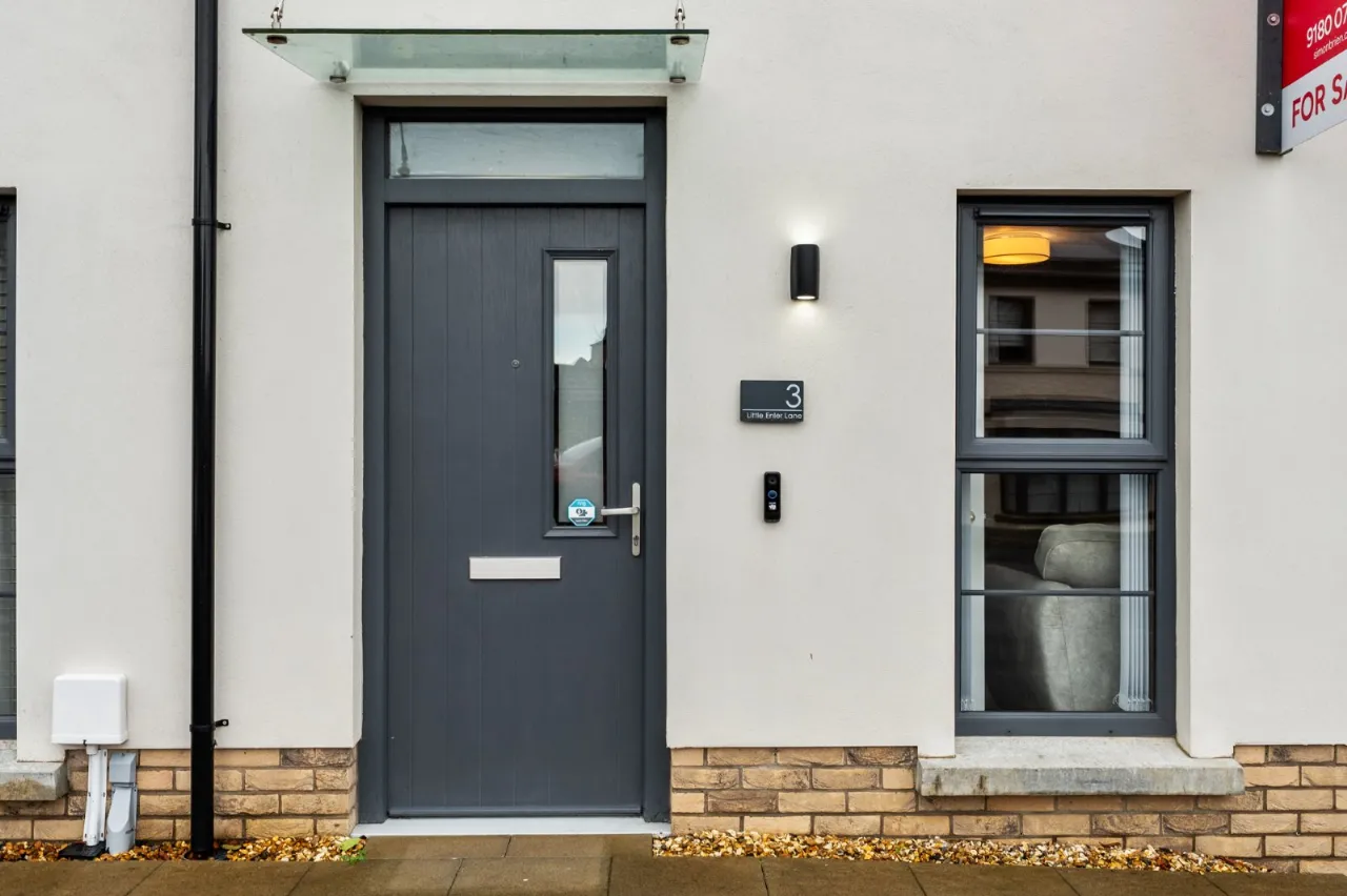 Glass canopy Entrance Porch, grey composite front door, outside light.