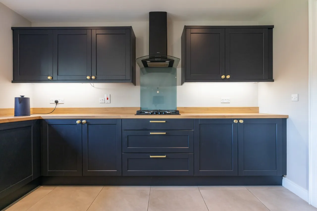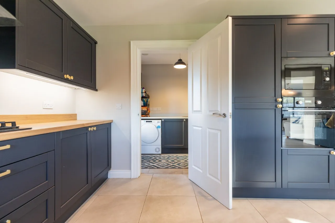 Single drainer stainless steel sink unit with mixer taps, range of high and low level matching 'Navy Blue' shaker style units, Formica roll edge work surfaces, plumbed for washing machine, recess for tumble dryer, concealed gas boiler, ceramic tiled floor, grey uPVC double glazed door to driveway.