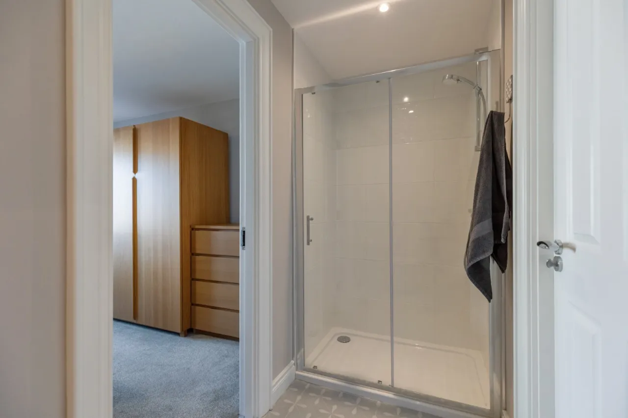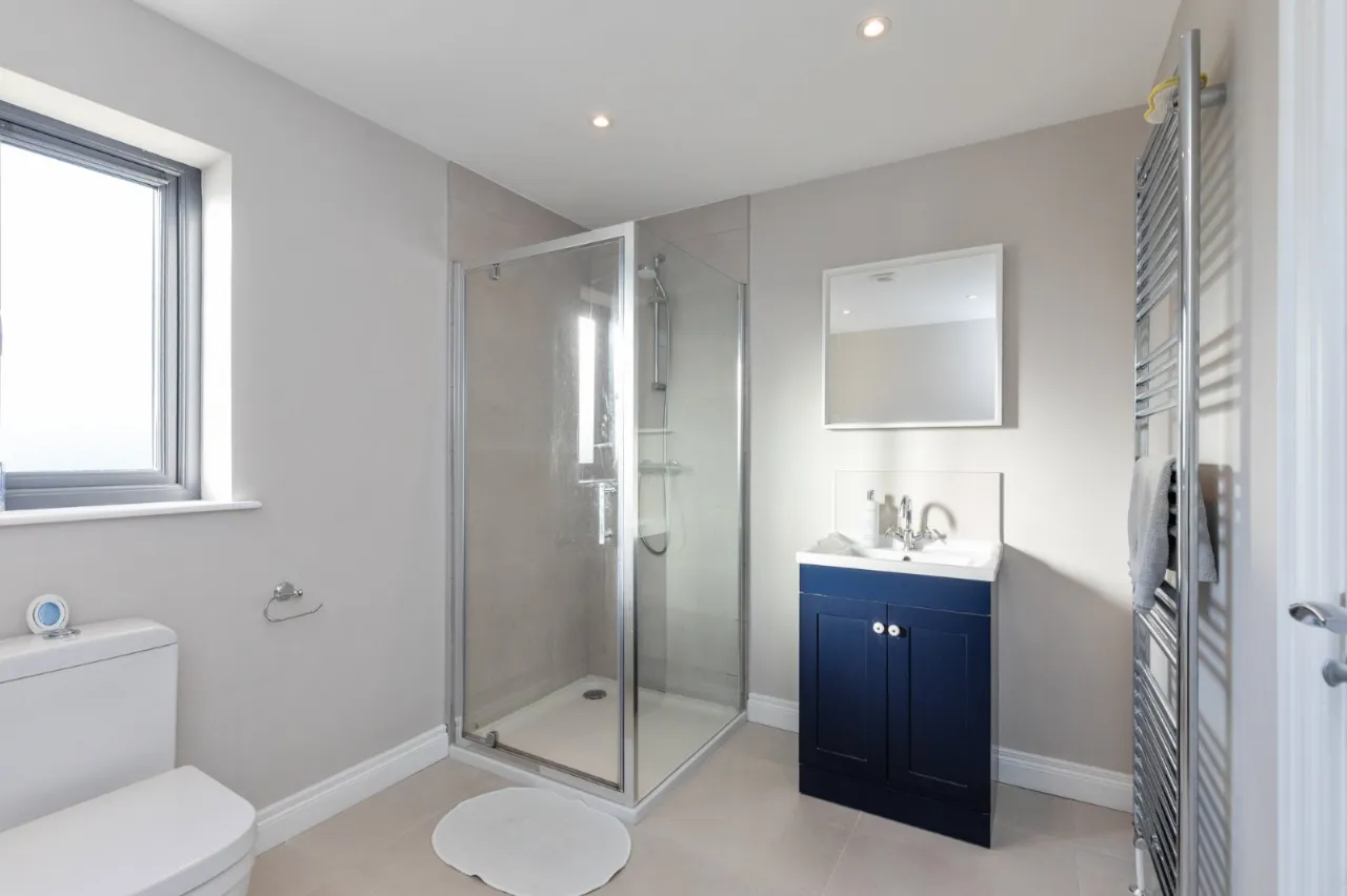 Modern white suite comprising: Large separate fully tiled shower cubicle with thermostatically controlled shower, drench head and telephone hand shower, wall mounted wash hand basin with mixer taps, push button WC, chrome towel radiator, feature ceramic tiled floor, LED recessed spotlighting, extractor fan, wired for wall mounted mirror.