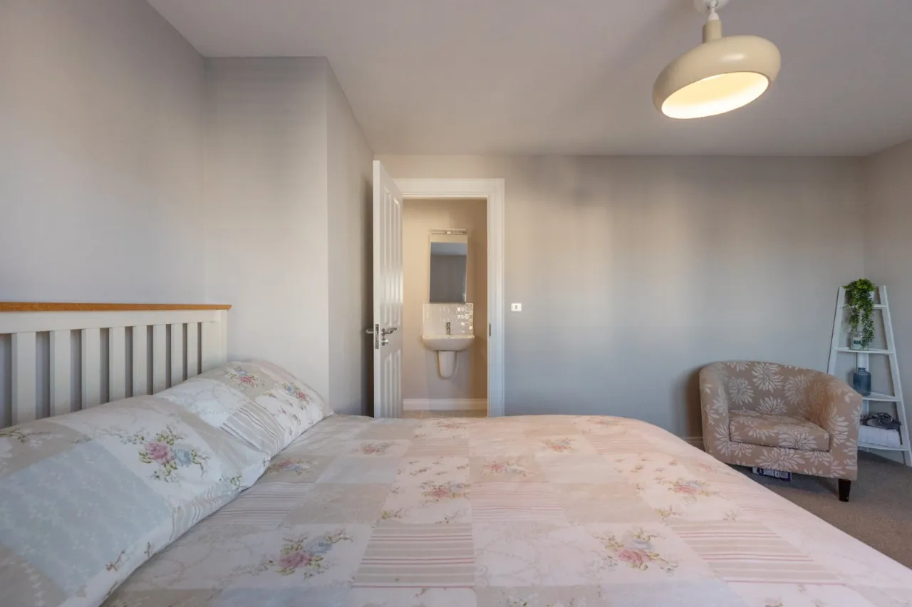 Modern white suite comprising: Large fully tiled shower cubicle with thermostatically controlled shower and telephone hand shower, wall mounted wash hand basin with mixer taps, push button WC, feature ceramic tiled floor, wall tiling, LED recessed spotlighting, extractor fan.