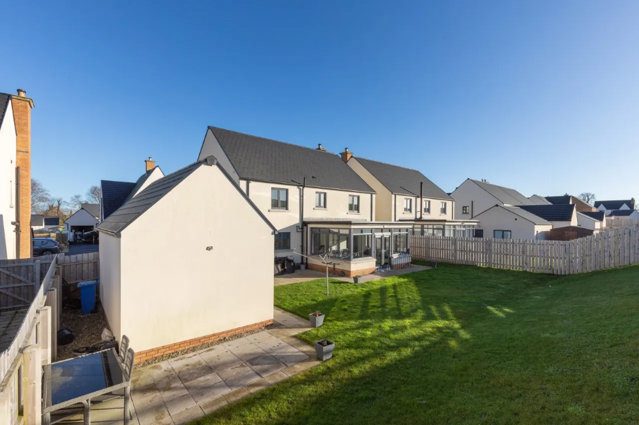 To front in ornamental lawn, shrub bed and paved path. Enclosed private garden to rear laid in manicured lawn, large, modern paved patios and paths, fencing, outside light, outside water tap, access to side for pedestrians, bins etc.