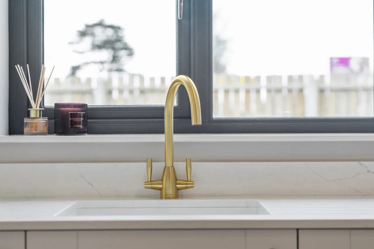 Luxury fitted kitchen with feature island unit, quartz worktops with undermounted sink, matching upstands and splashback. Quality doors & handles.