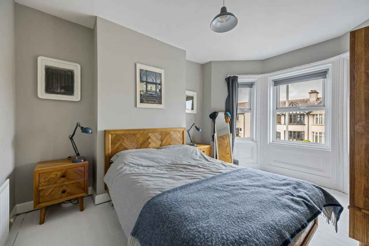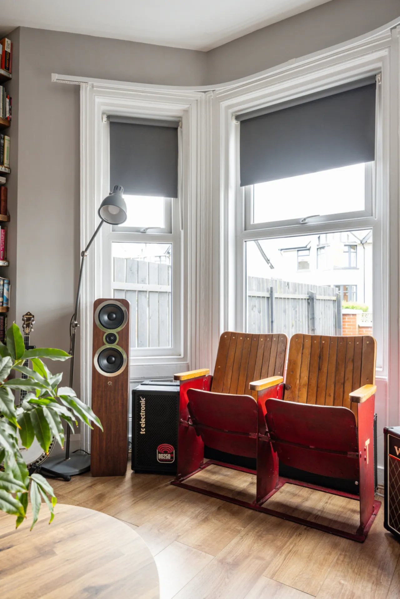 Electric fire, laminate wood flooring, bay window.
