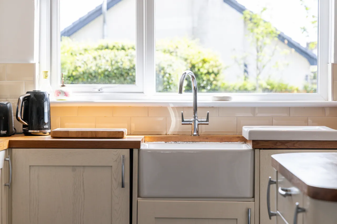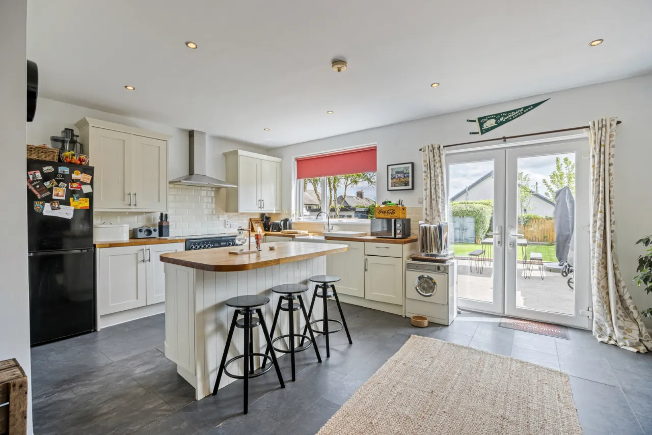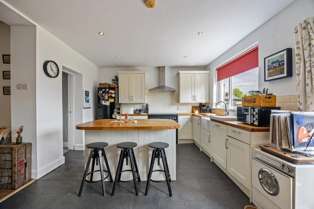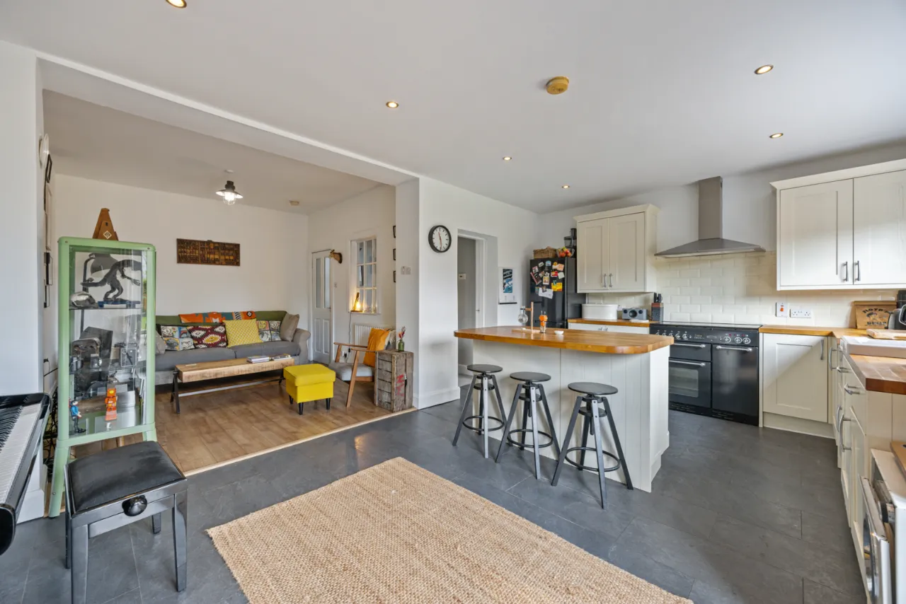 Full range of high and low level units with oak work surfaces, recess for cooker, Belfast sink with mixer taps, built in dishwasher, partly tiled walls, central island with oak work surfaces, open to: