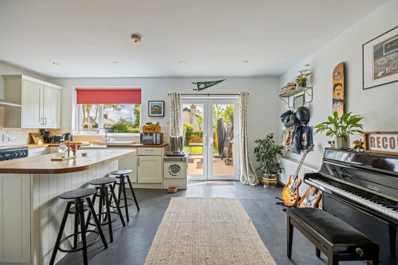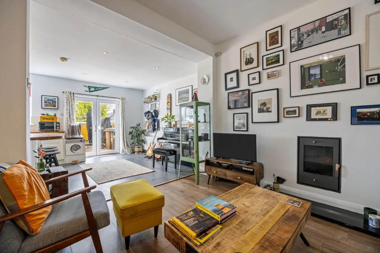 Glass fronted wood burning stove, wood laminate flooring, French double doors to rear.