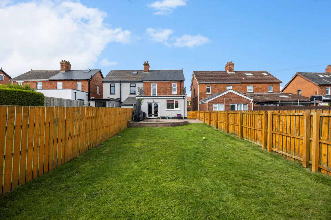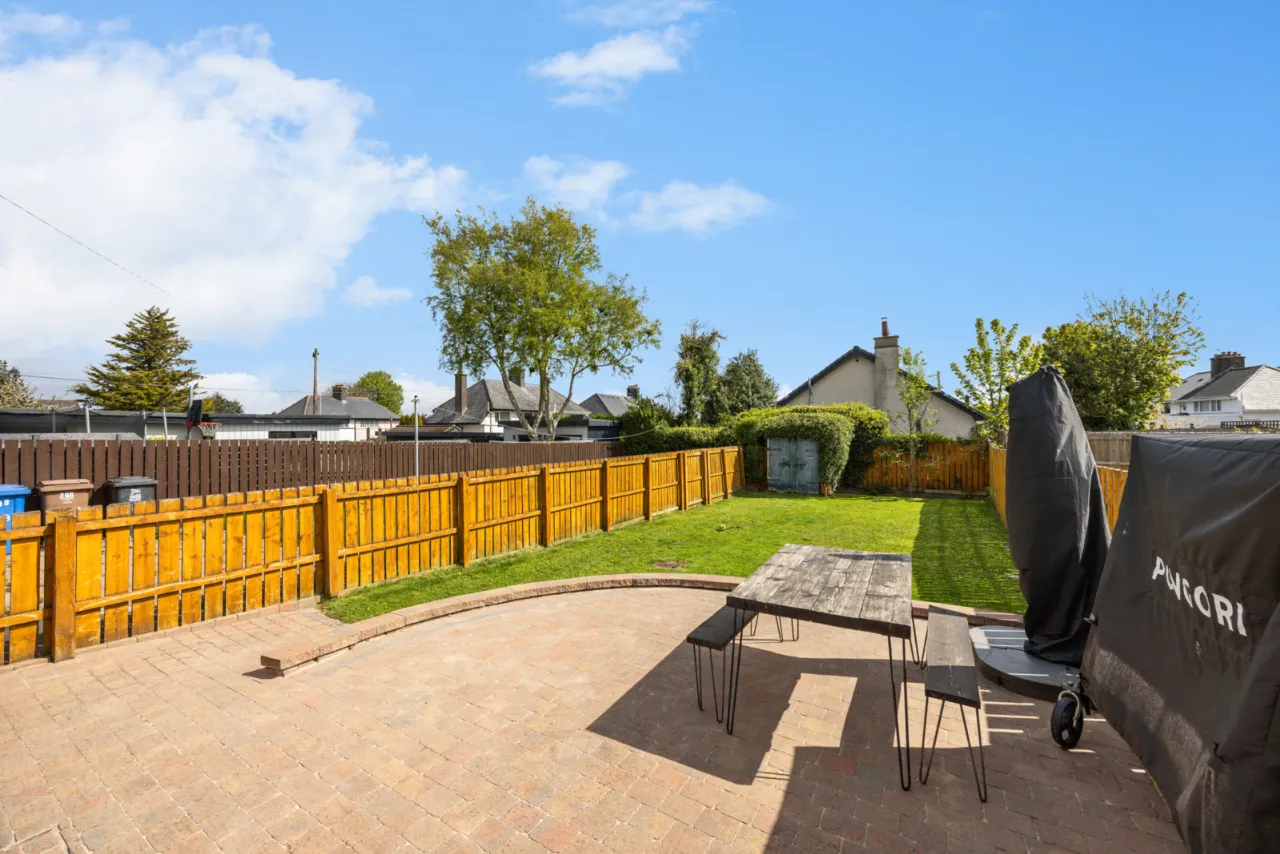 To the front is parking for 2 cars and a shared side driveway. To the rear is a paved patio and large garden laid in lawn.