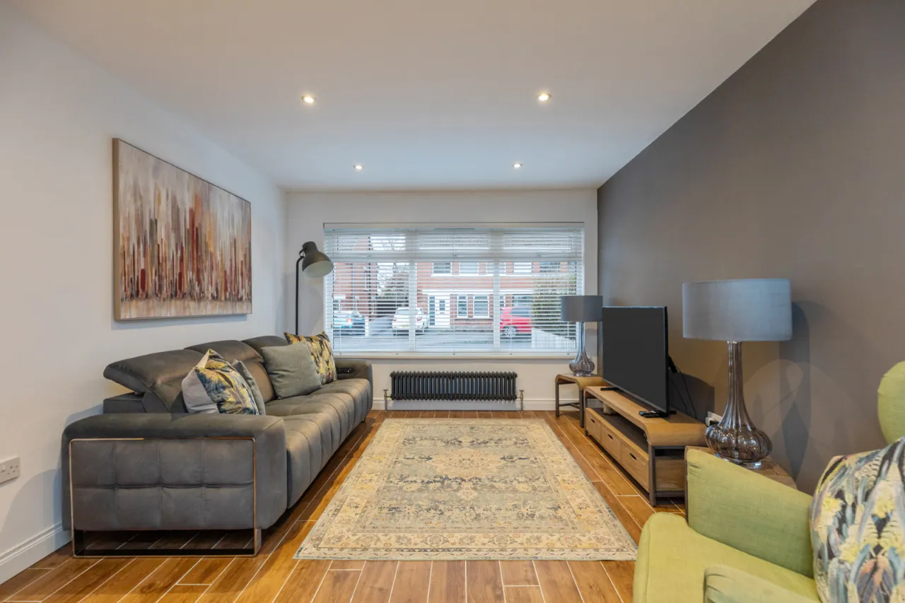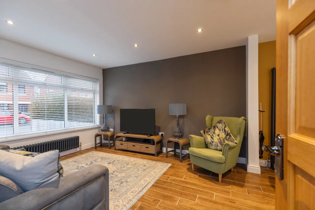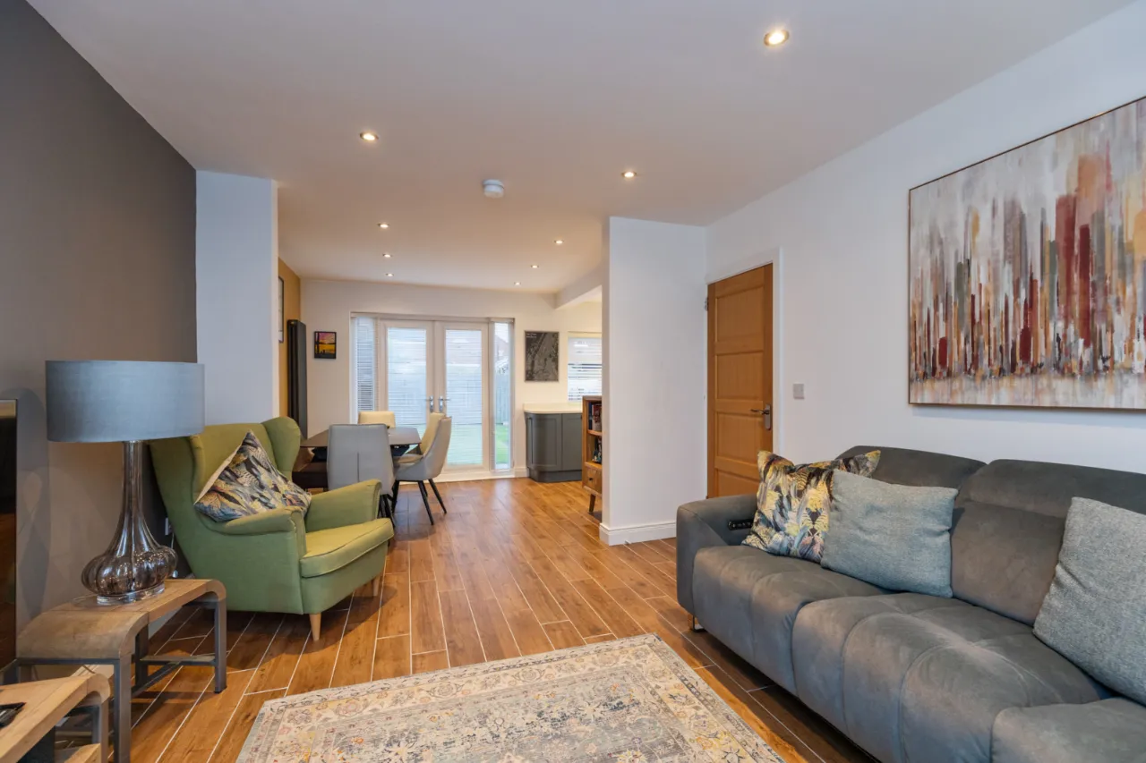 Outlook to front, wood effect tiled flooring, open to kitchen / dining area.