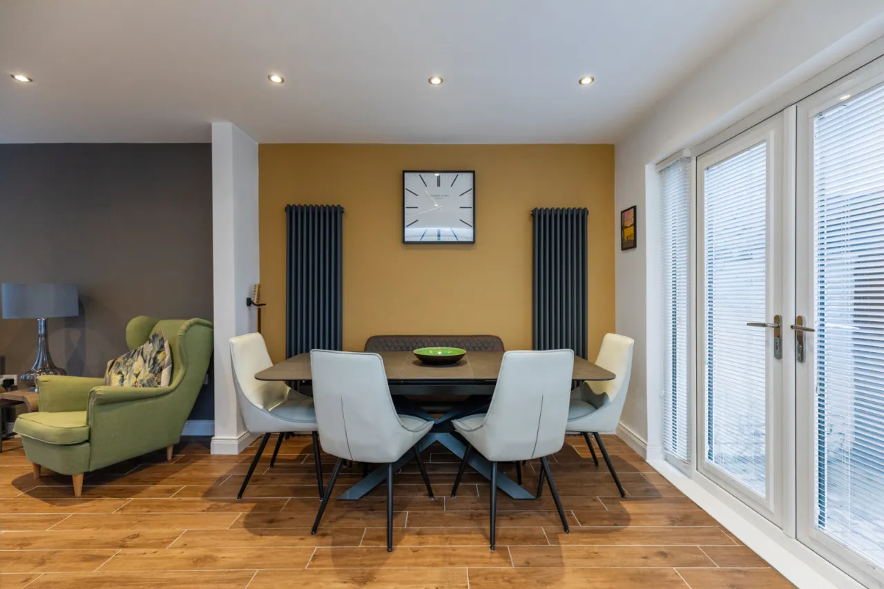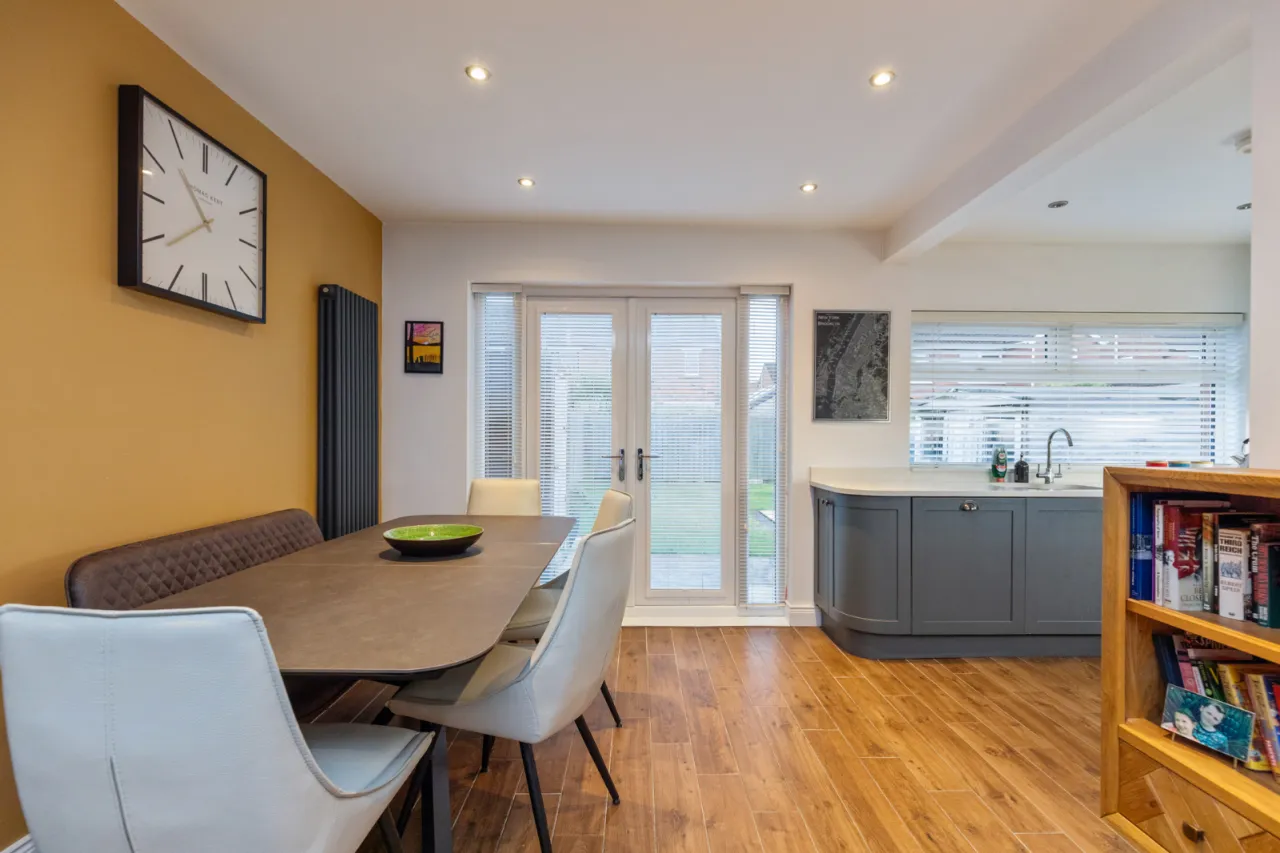 Excellent range of high and low level units, granite work surface with inset stainless steel sink unit and drainer, 1.5 tub with mixer tap. Integrated fridge freezer, integrated hot point oven with four ring gas hob above, stainless steel extractor fan, granite kitchen splashback, integrated dishwasher, integrated washing machine, recessed spotlighting, wood effect tiled flooring. Open to dining area with uPVC French doors leading to rear garden.