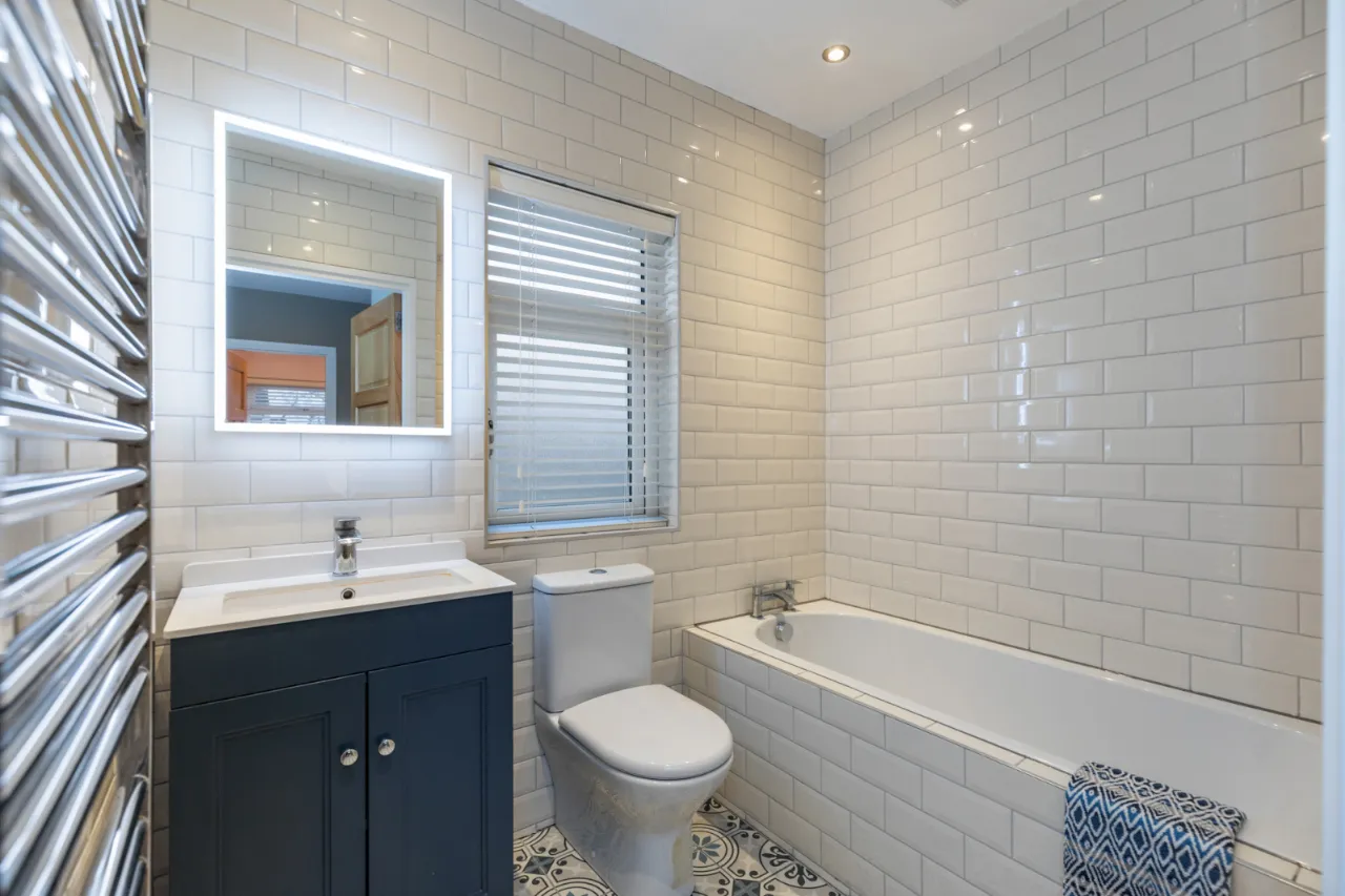 White suite comprising of low flush W/C, wash hand basin with mixer tap and storage below, tiled bath with hot and cold tap, separate walk-in themostatically controlled shower with rainfall shower head and handset, tiled flooring, fully tiled walls, recessed spotlighting, extractor fan, vertical chrome heated towel rail.