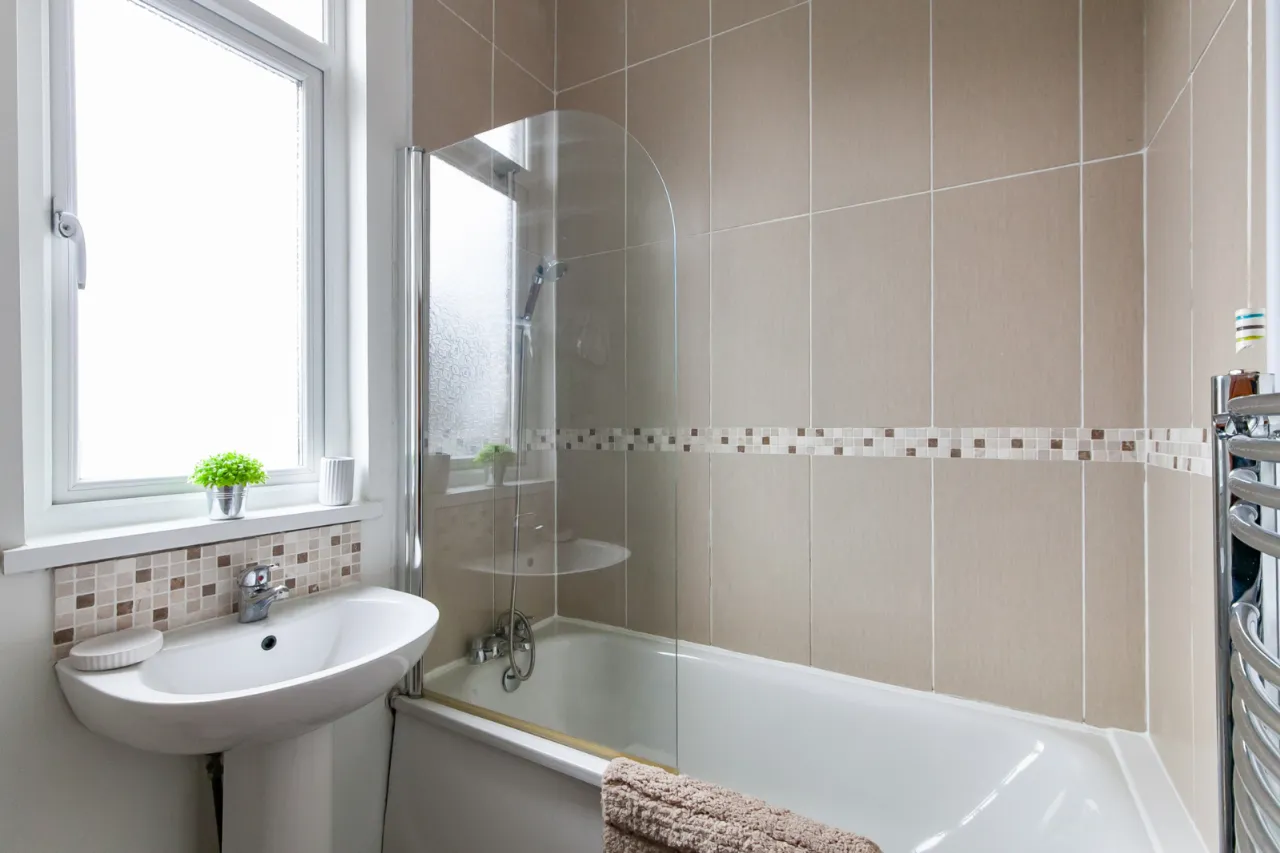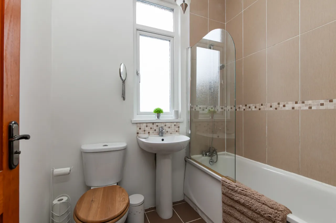 Situated on the return, comprises a low flush WC, wash hand basin with mixer tap and bath with overhead shower and partial glass shower-screen, tiled to ceiling height around the shower area.
