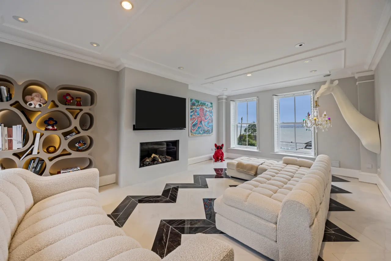 Natural stone tiled floor. Corniced ceiling. Mood lighting settings. Double picture windows overlooking gardens, Belfast Lough and the Co. Antrim hills and beyond.