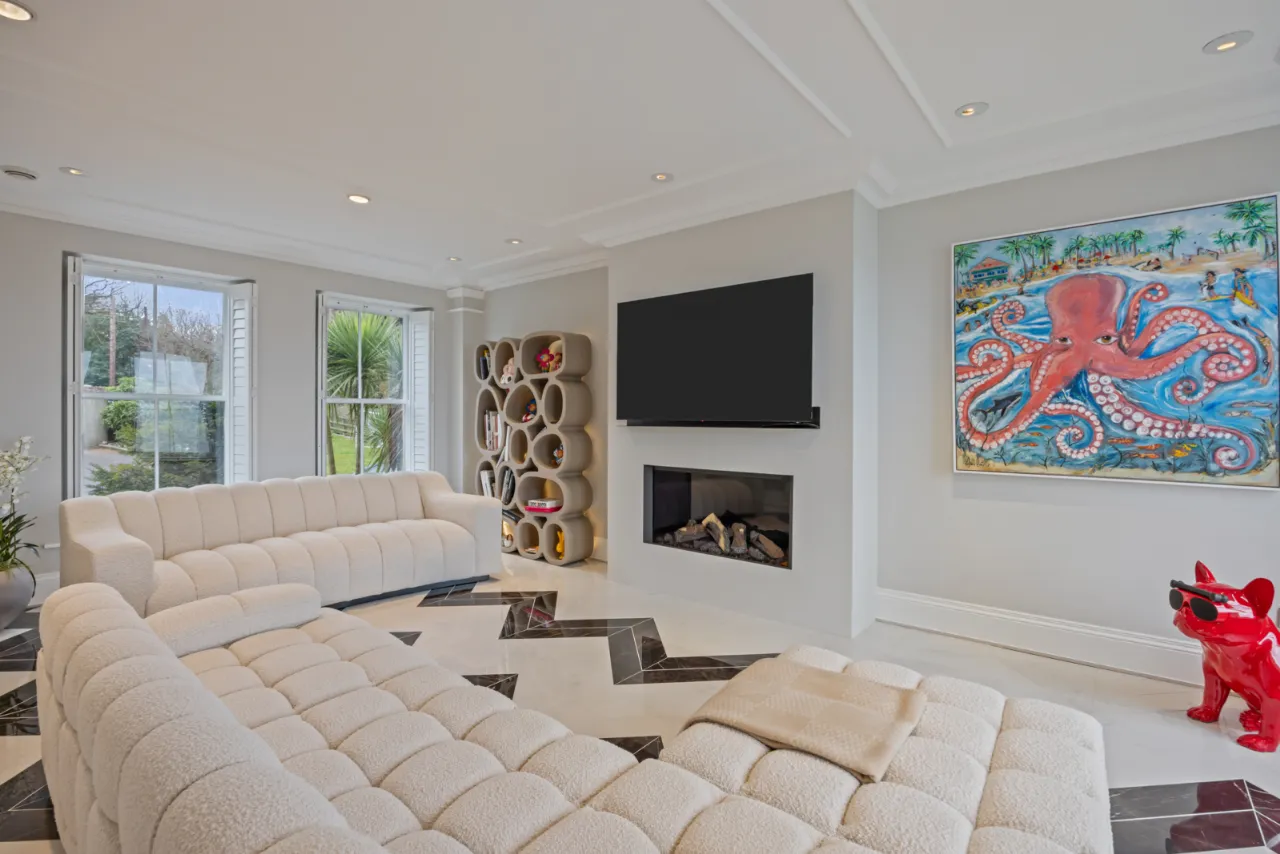 Solid Irish beechwood floor. Detailed corniced ceiling. Multi function light system. Natural stone fireplace with mantle piece, hearth, cast iron dog basket and inset gas fire. Picture windows overlooking gardens, Belfast Lough and the Co. Antrim hills and beyond.