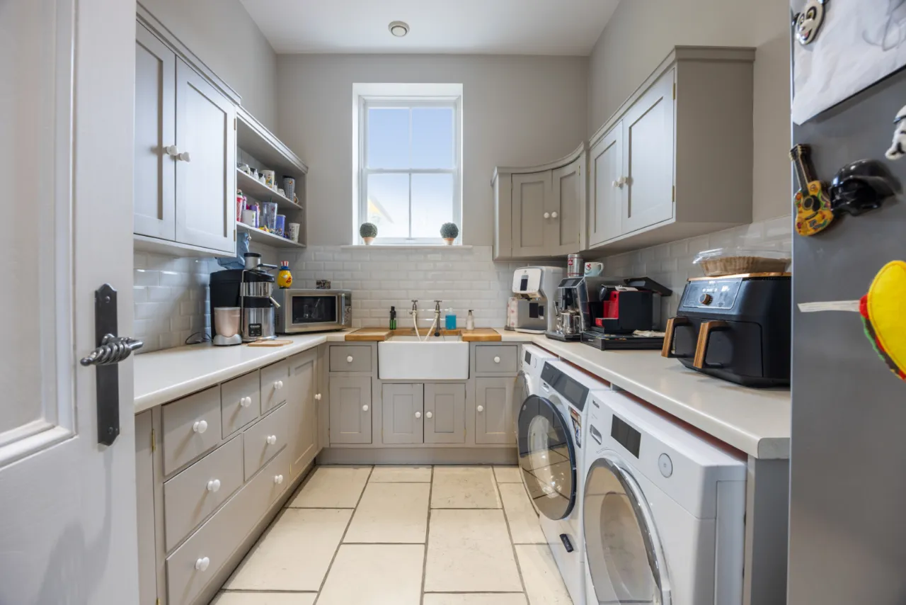 Natural stone floor. Plumbed for two washing machines. Dryer. Roll edge work tops and shaker style hand built wooden cupboard, drawers and shelves. Feature Belfast style sink with mixer taps and wooden trim. Partly tiled walls.